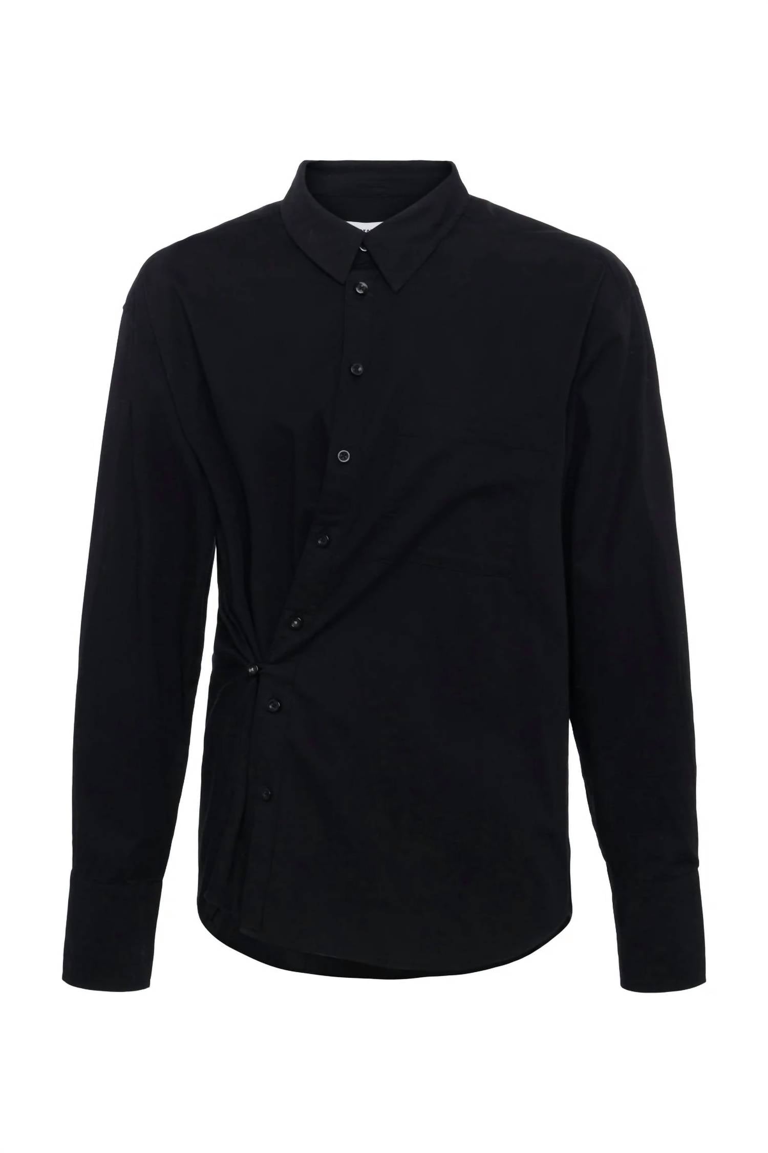 Com mangas compridas e gola alta, esta camisa é confeccionada em popeline de algodão fresco e tem um estilo clássico em preto. Confeccionada em 100% poliéster na China, possui fecho de botão realçado por um botão cruzado exclusivo. Fácil de cuidar, ela pode ser lavada na máquina com água fria.