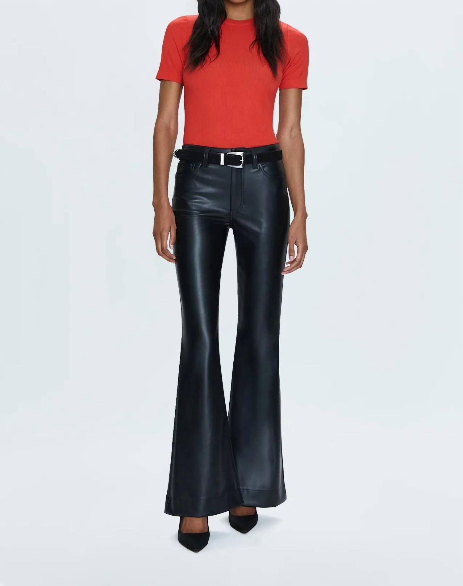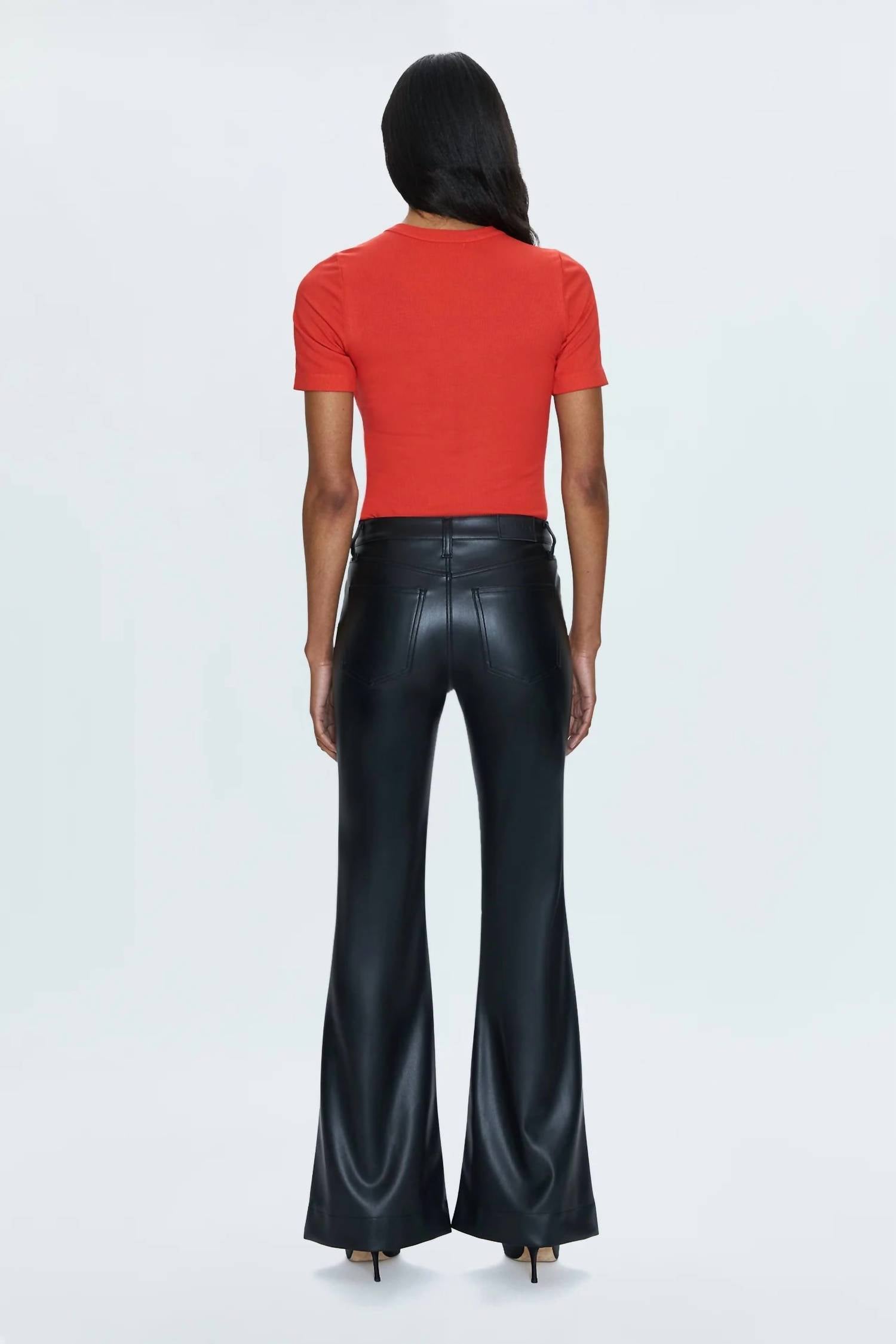Combine esta calça jeans de perna larga com mules, slides ou suas sandálias de tiras favoritas. Apresentamos a calça jeans Kinsley Flare da PISTOLA, uma peça de destaque na sofisticada cor Slate Black com acabamento exclusivo em couro vegano alternativo. Esta calça jeans feminina flare e de perna larga é confeccionada em 100% poliuretano, com caimento relaxado, cintura média, perna ultralarga e fecho de zíper. Projetada para um efeito dramático, a calça jeans possui 25 cm de altura, 84 cm de costura interna e 58 cm de abertura na perna. Perfeita para ocasiões de outono, como jantares e vésperas de Ano Novo, esta calça precisa ser lavada a seco para manter seu estilo impecável. A modelo veste tamanho 26 e tem 1,75 m de altura.
