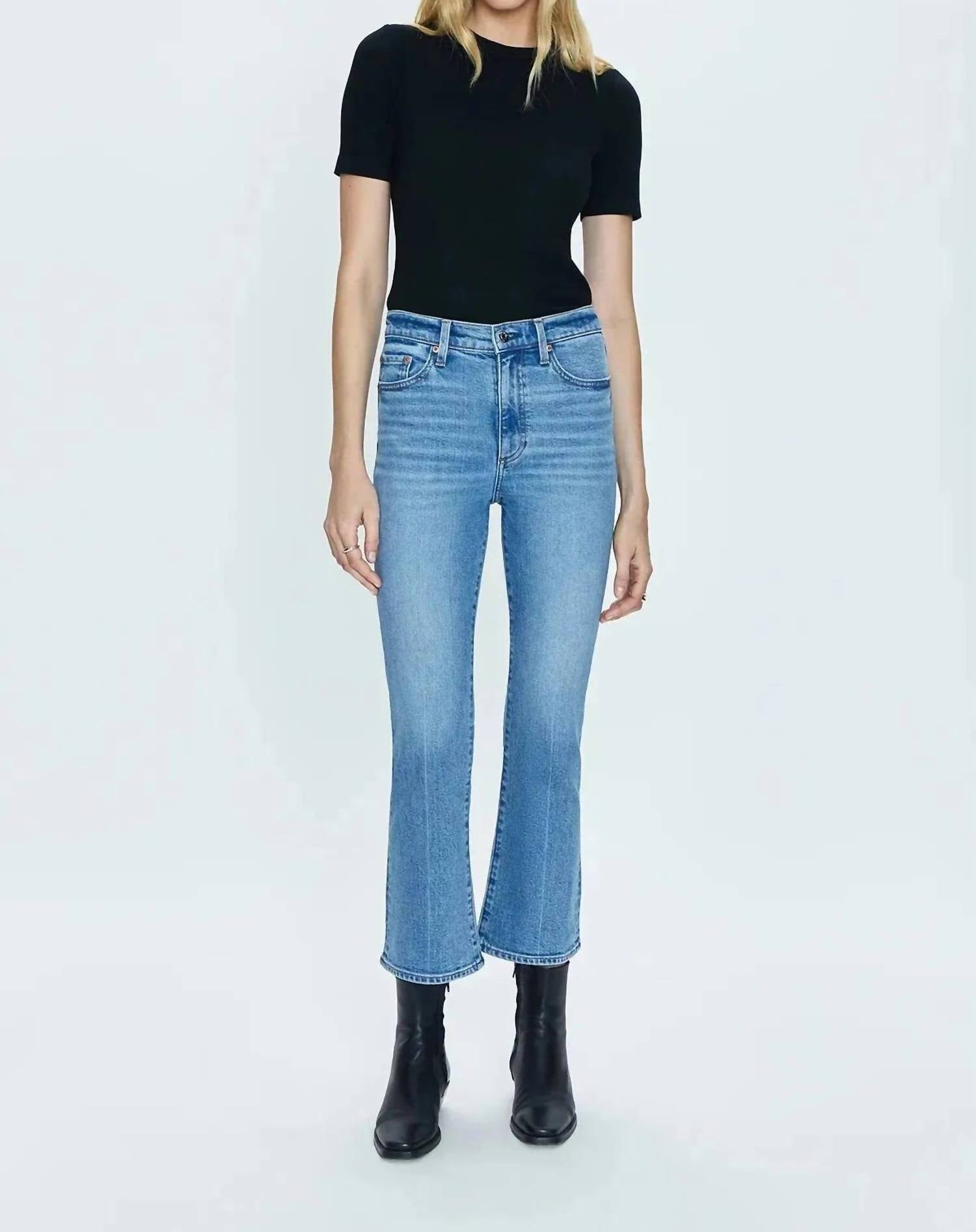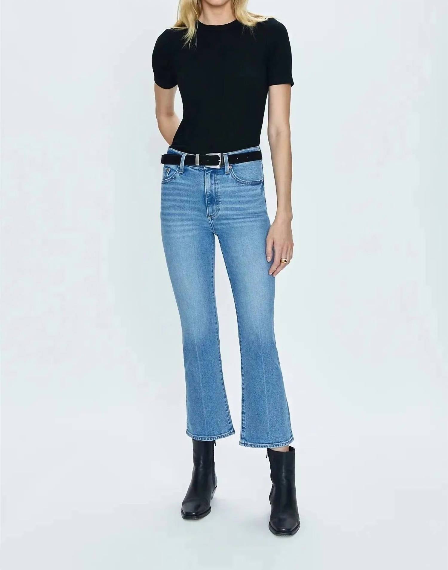 O jeans cropped perfeito para as estações de transição. O jeans bootcut possui cintura alta. Apresenta uma costura interna cropped de 68 cm que abraça os quadris. Confeccionado em uma confortável mistura de 99% algodão e 1% elastano. O fechamento é fácil com um botão. Oferecendo estilo e praticidade. A abertura de 42 cm na perna complementa qualquer par de botas divertidas, criando um look dinâmico, perfeito para qualquer ocasião.