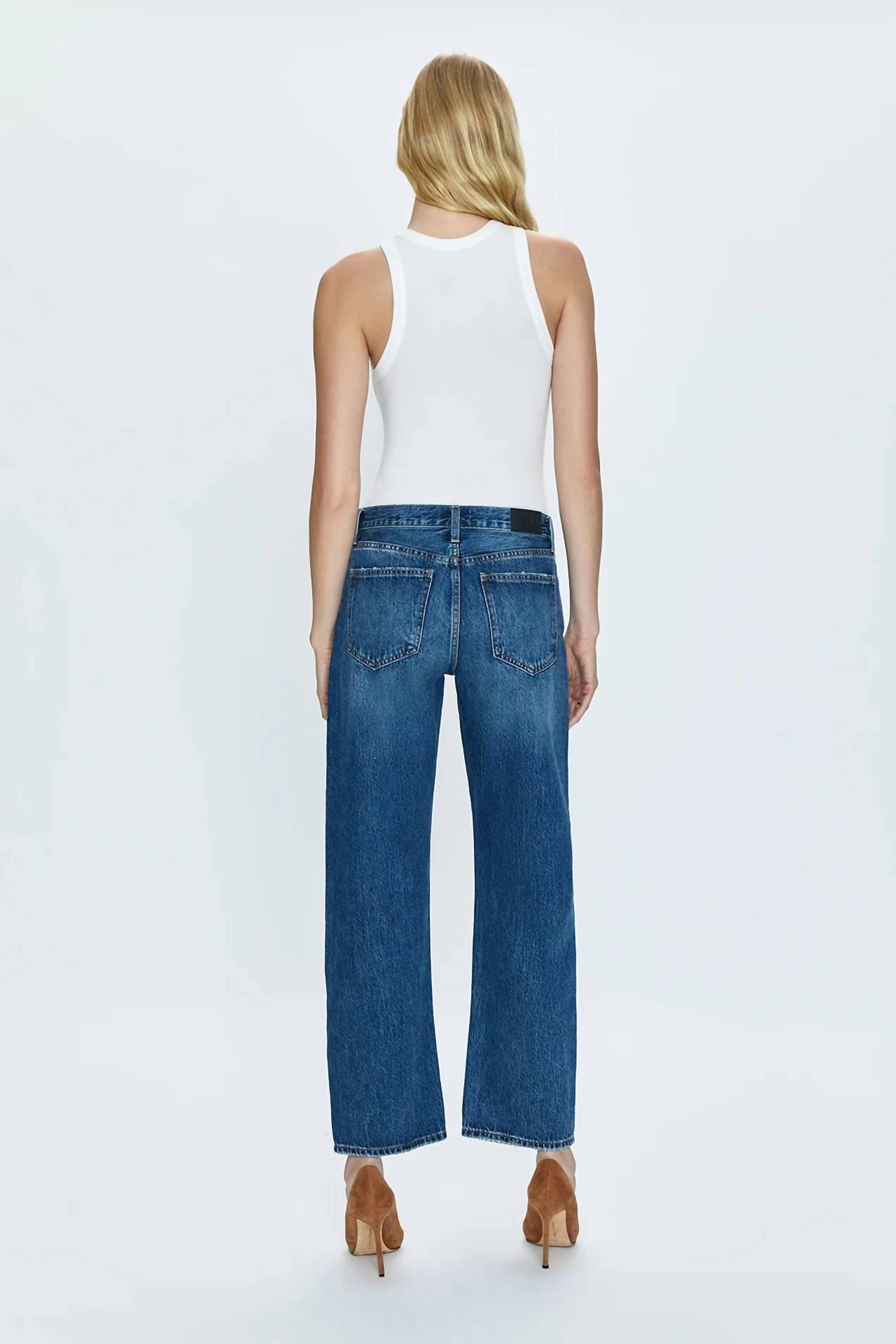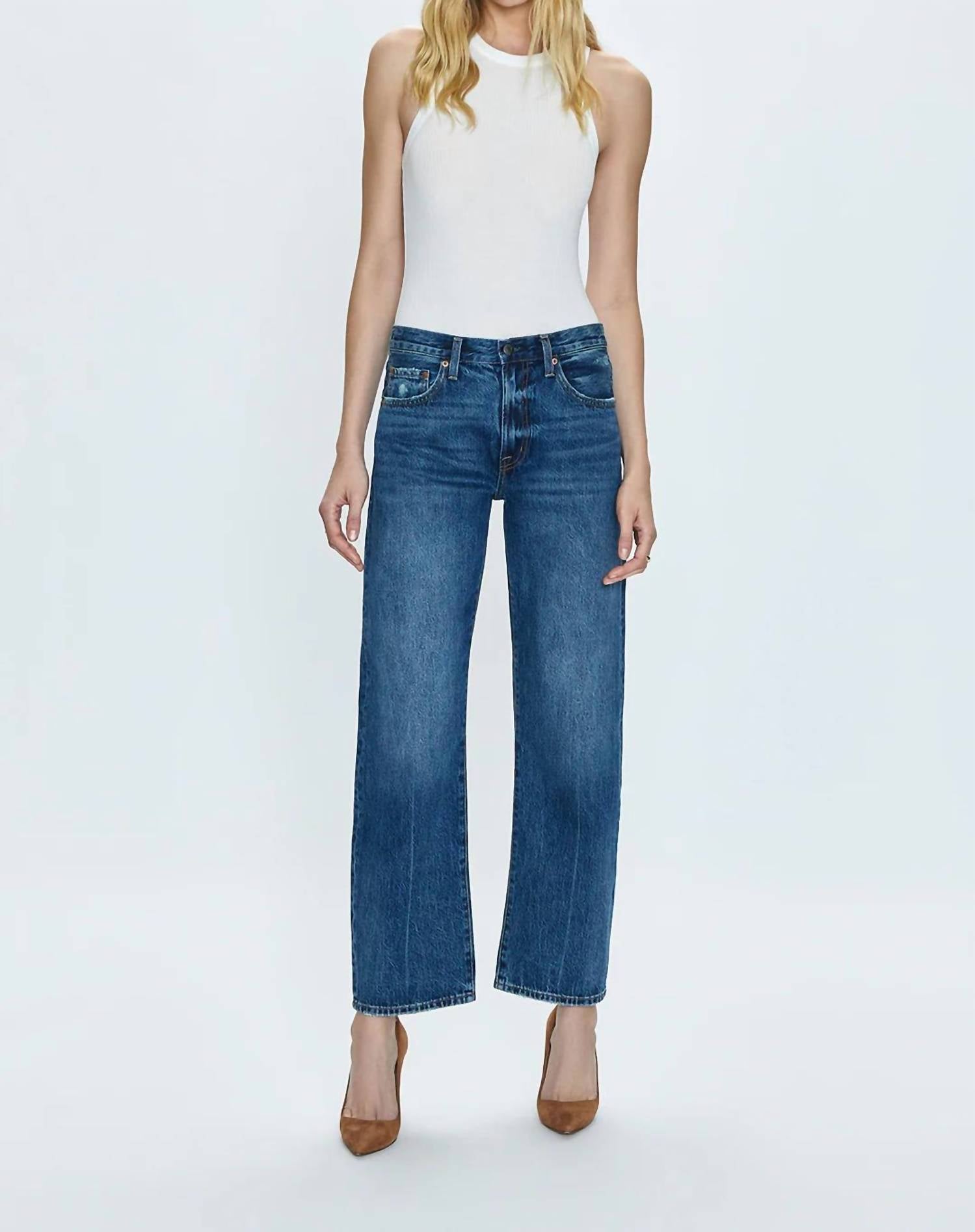 Este jeans clássico de perna reta tem um ajuste perfeito e combina com quase tudo. A Calça Jeans Lexi Mid Rise Bowed Straight da PISTOLA oferece uma silhueta arqueada exclusiva com cintura média e pernas retas que se curvam nos joelhos para um ajuste estilo barril. Confeccionada em 100% algodão, esta calça jeans apresenta um corte curto chique na altura do tornozelo e está disponível na cor Artisan com lavagem escura, realçada por um leve desbotamento ao redor dos joelhos e coxas. Ela mede 25 cm de altura, 73 cm de costura interna e 44 cm de abertura nas pernas, proporcionando um caimento relaxado perfeito para um look casual. Fechamento: Botão. Cuidados: Lavar à máquina. A modelo tem 1,75 m e veste tamanho 26.