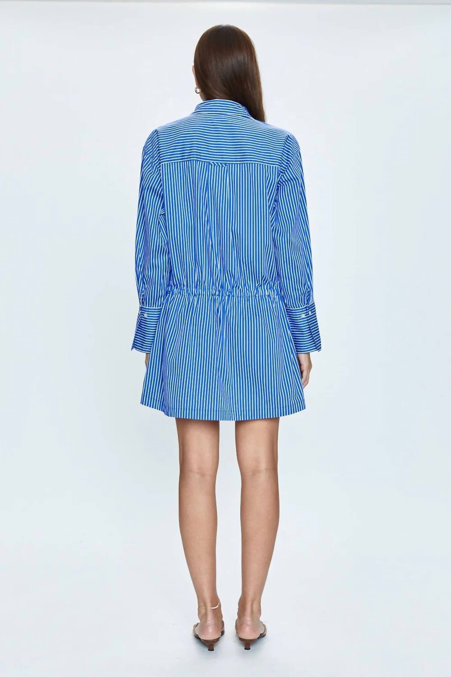 Confortável e fofo, este vestido casual para o dia a dia tem tudo. O Vestido Lucinda Cinched Waist da PISTOLA é uma escolha cativante para qualquer ocasião, exalando sofisticação com um toque descontraído. Com mangas longas e um corte em A elegante, este vestido listrado azul-marinho é confeccionado em uma mistura de algodão para conforto e estilo. Possui cintura marcada, gola estilosa e bolsos funcionais, tudo isso realçado por um fecho de botão. Instruções de cuidado: lavar somente à mão.