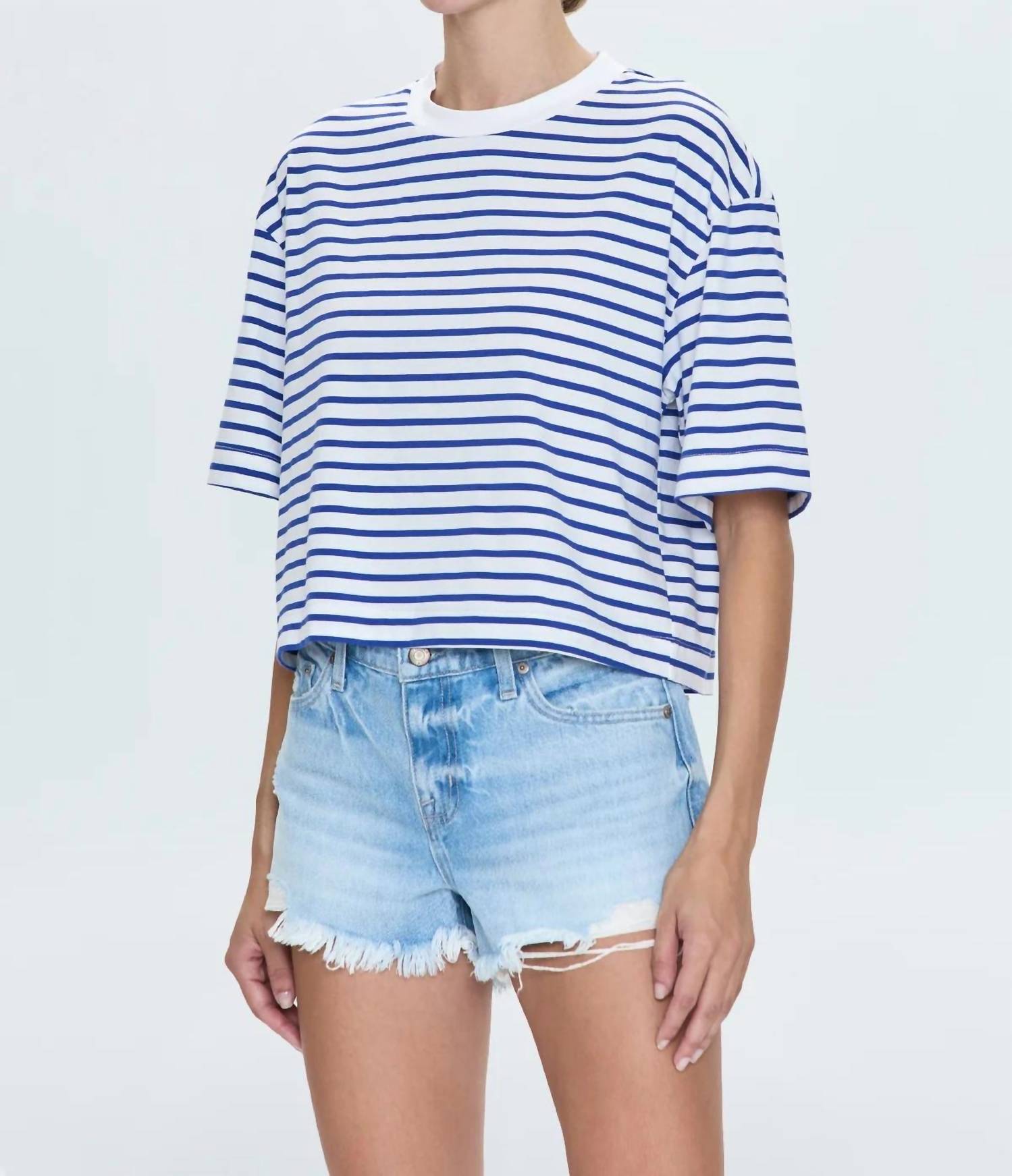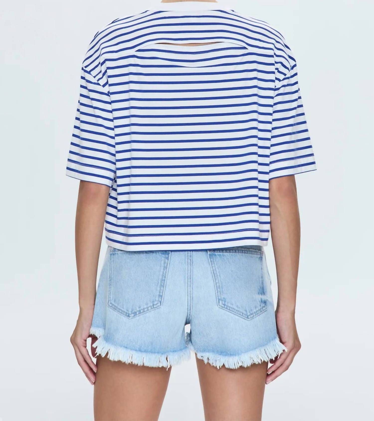 A camiseta de manga curta que você vai querer em todas as cores. Apresentamos a Mae Cropped Boxy Top da PISTOLA, uma camiseta despojada e despojada, perfeita para um estilo minimalista. Com mangas curtas e modelagem boxy, esta camiseta apresenta um recorte atraente nas costas e uma estampa listrada em Branco Marítimo. Confeccionada em 100% algodão, esta camiseta cropped mede 48 cm de comprimento e conta com um prático fecho pull-on. Ideal para um guarda-roupa de férias de primavera.