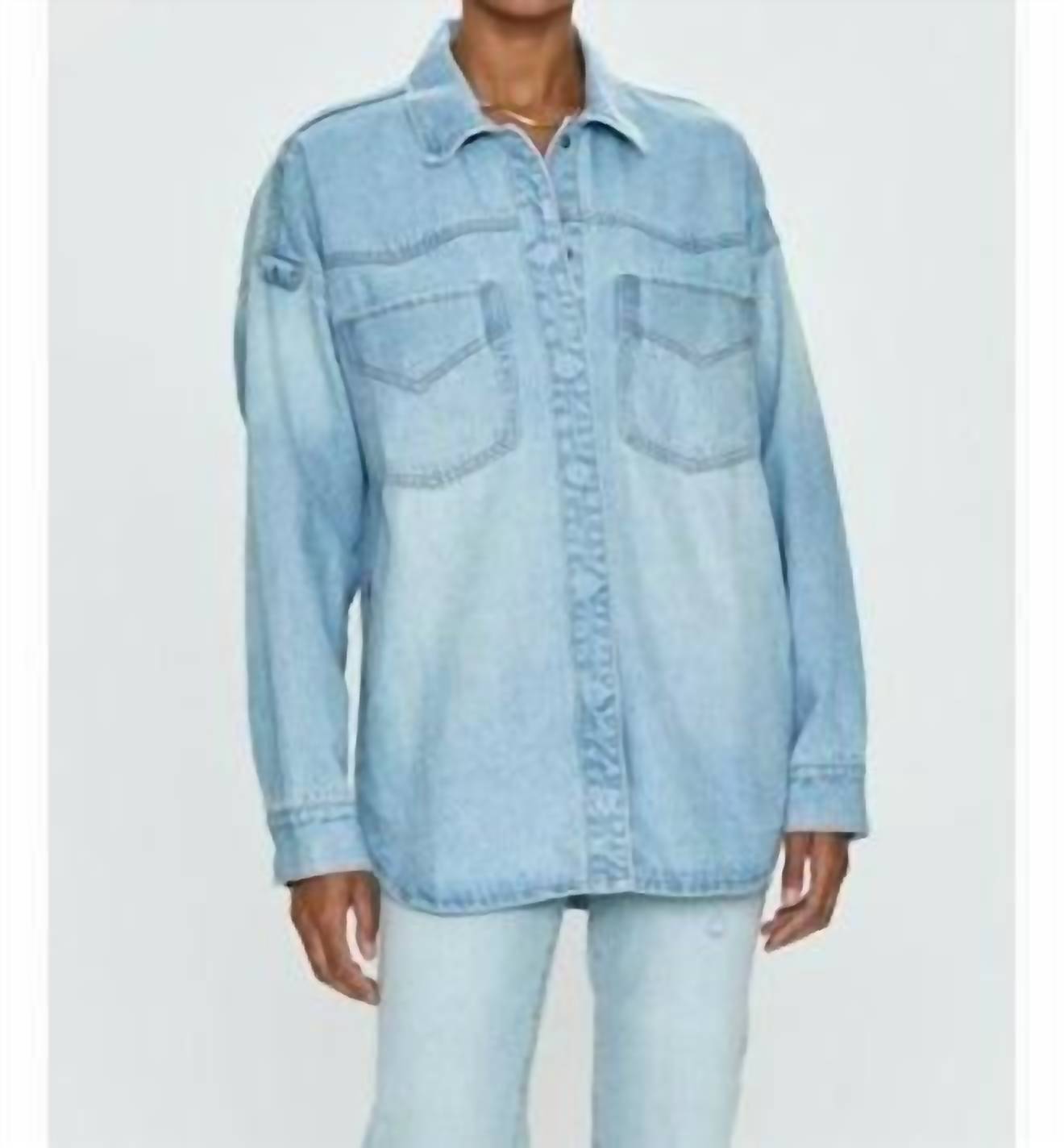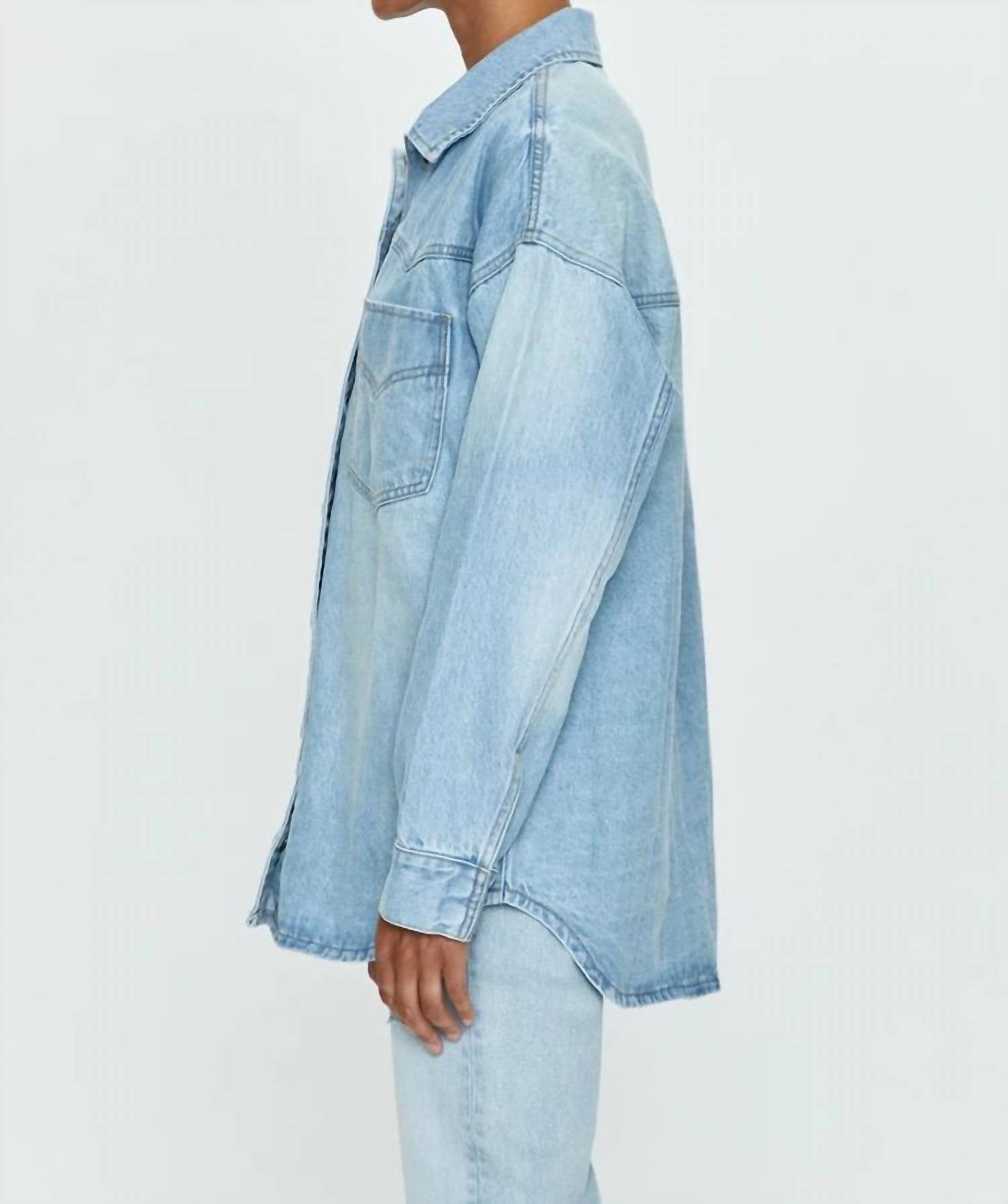 A jaqueta jeans perfeita para aqueles dias um pouco mais frios entre as estações. Eleve seu guarda-roupa de viagem com a Jaqueta Jeans Oversized Mandy da PISTOLA, uma escolha estilosa em uma cor sólida radiante. Com mangas longas e gola clássica, esta jaqueta jeans é confeccionada em uma mistura respirável de 55% cânhamo e 45% algodão orgânico. O design funcional inclui vários bolsos e um fecho de botão seguro. Ideal para aventuras na primavera. Observe que as instruções de lavagem e secagem não são fornecidas.