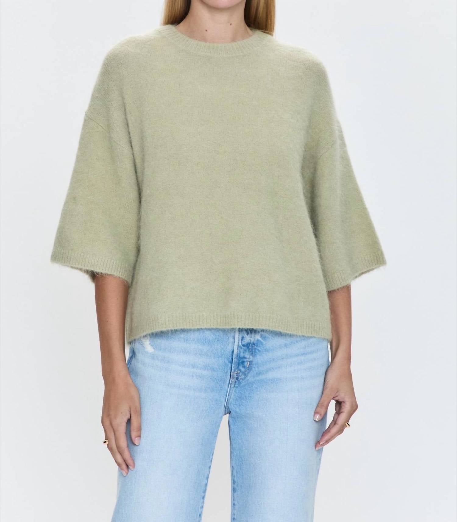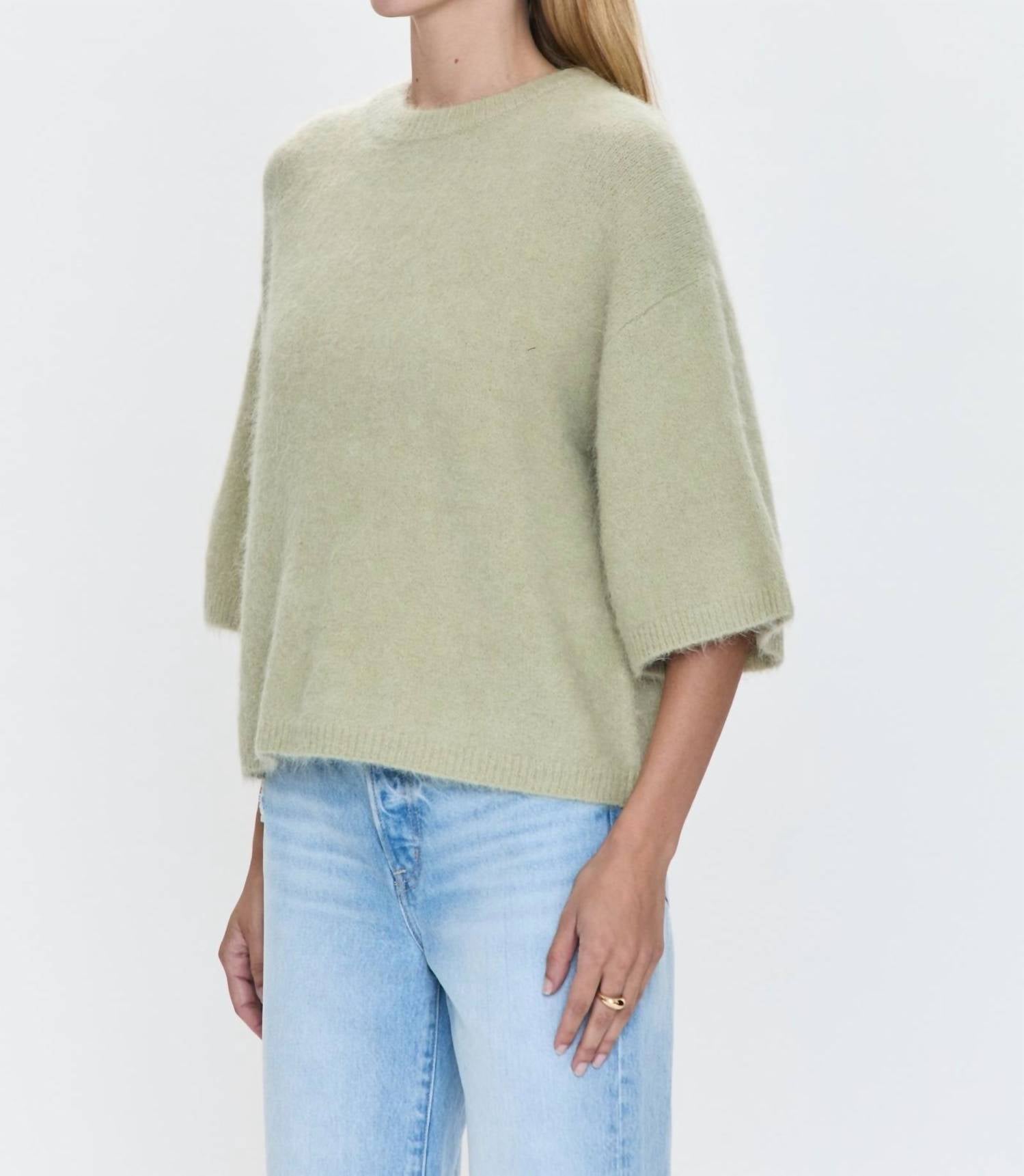 Descubra o Top Micah da PISTOLA, uma blusa chique em tom pistache claro, confeccionada com uma mistura de lã de peso médio para um toque ultramacio. Desenhada com mangas até o cotovelo, esta peça apresenta uma silhueta relaxada e quadrada, com ombros caídos e decote redondo. Confeccionada em uma mistura de nylon, incluindo 55% alpaca, 43% nylon e 2% elastano, mede 57 cm de comprimento e é importada. Fechamento: Puxe. Cuidados: Lavar à mão e secar na horizontal.