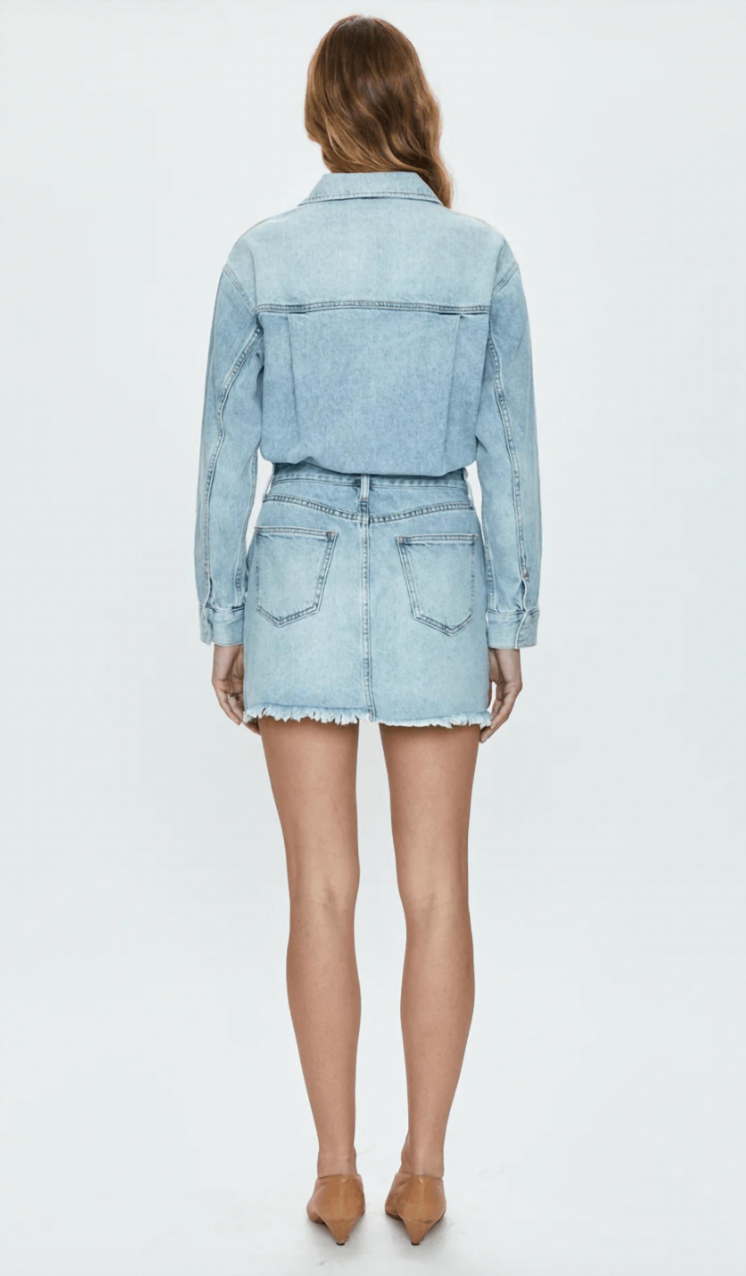 O tipo de vestido prático e elegante que você vai querer usar a qualquer hora do dia. Blusa de manga comprida com botões que se estende até uma minissaia com bainha crua. Tecido jeans verdadeiro que não estica, bolsos e passantes de cinto funcionais. 100% algodão. Lavar com água fria.