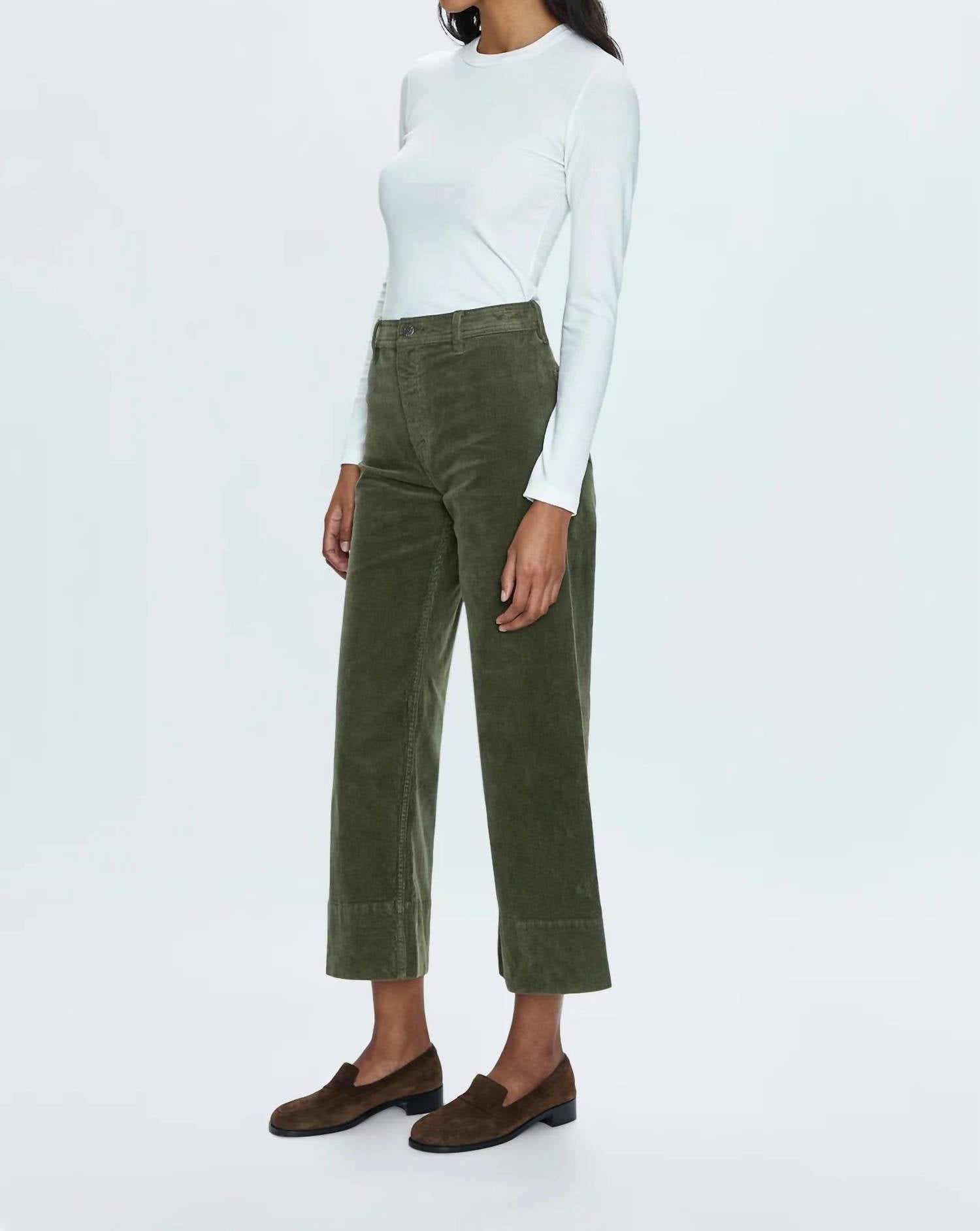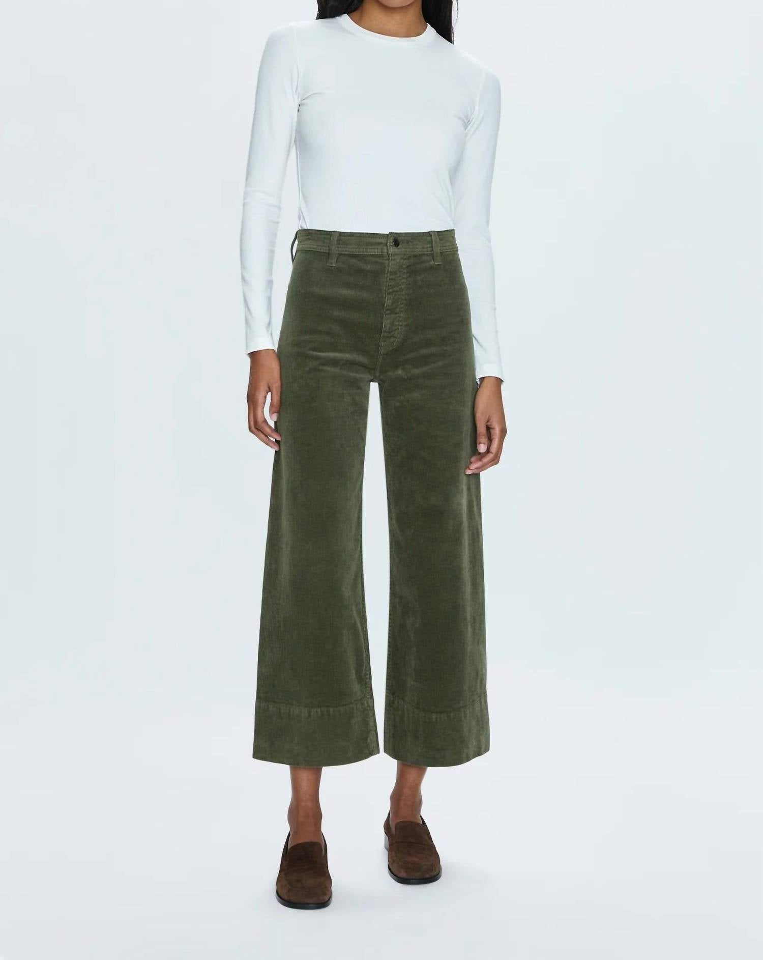 Apresentamos a Calça Crop Penny de Cintura Alta e Perna Larga da PISTOLA, uma peça essencial para o seu guarda-roupa em um sofisticado tom Martini. Esta calça de cintura alta apresenta um caimento relaxado com pernas largas, confeccionada em veludo cotelê de algodão com textura macia, com 2% de elastano para maior conforto e elasticidade. O modelo é complementado por um fecho de zíper e bolsos práticos, realçados por uma cintura com costura dupla e bainhas largas com punhos. Perfeita para combinar com seus itens essenciais favoritos de outono.