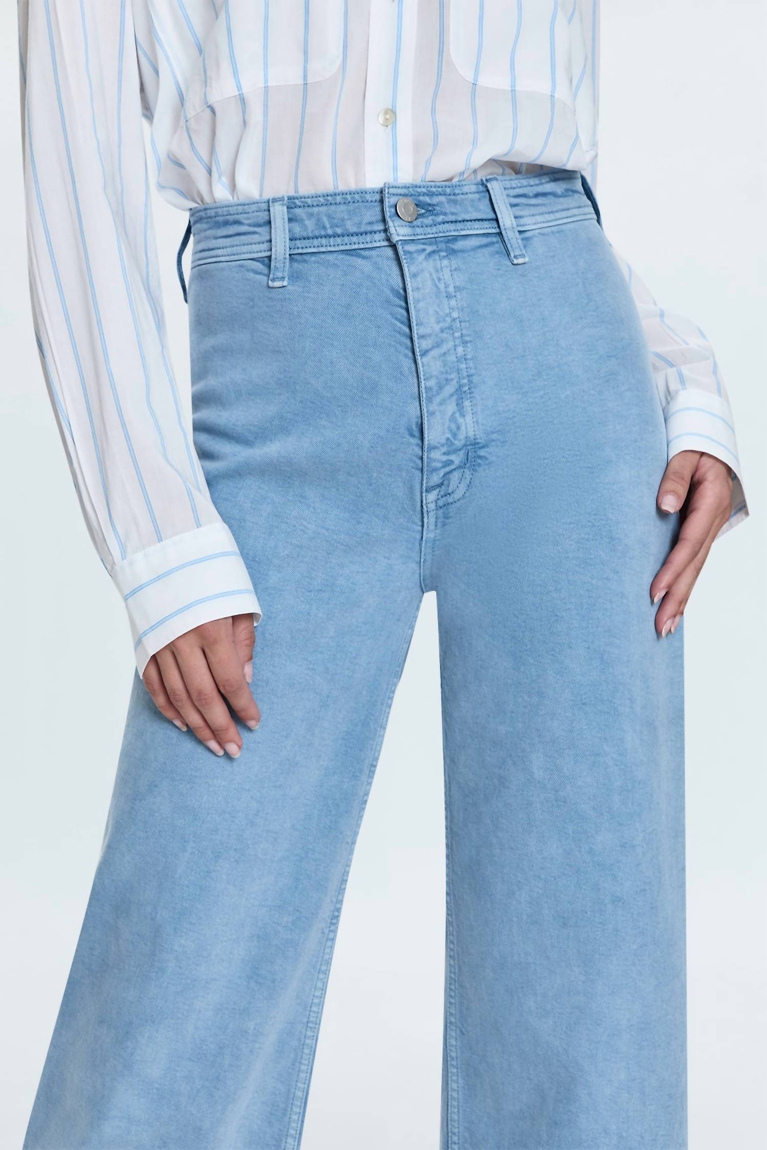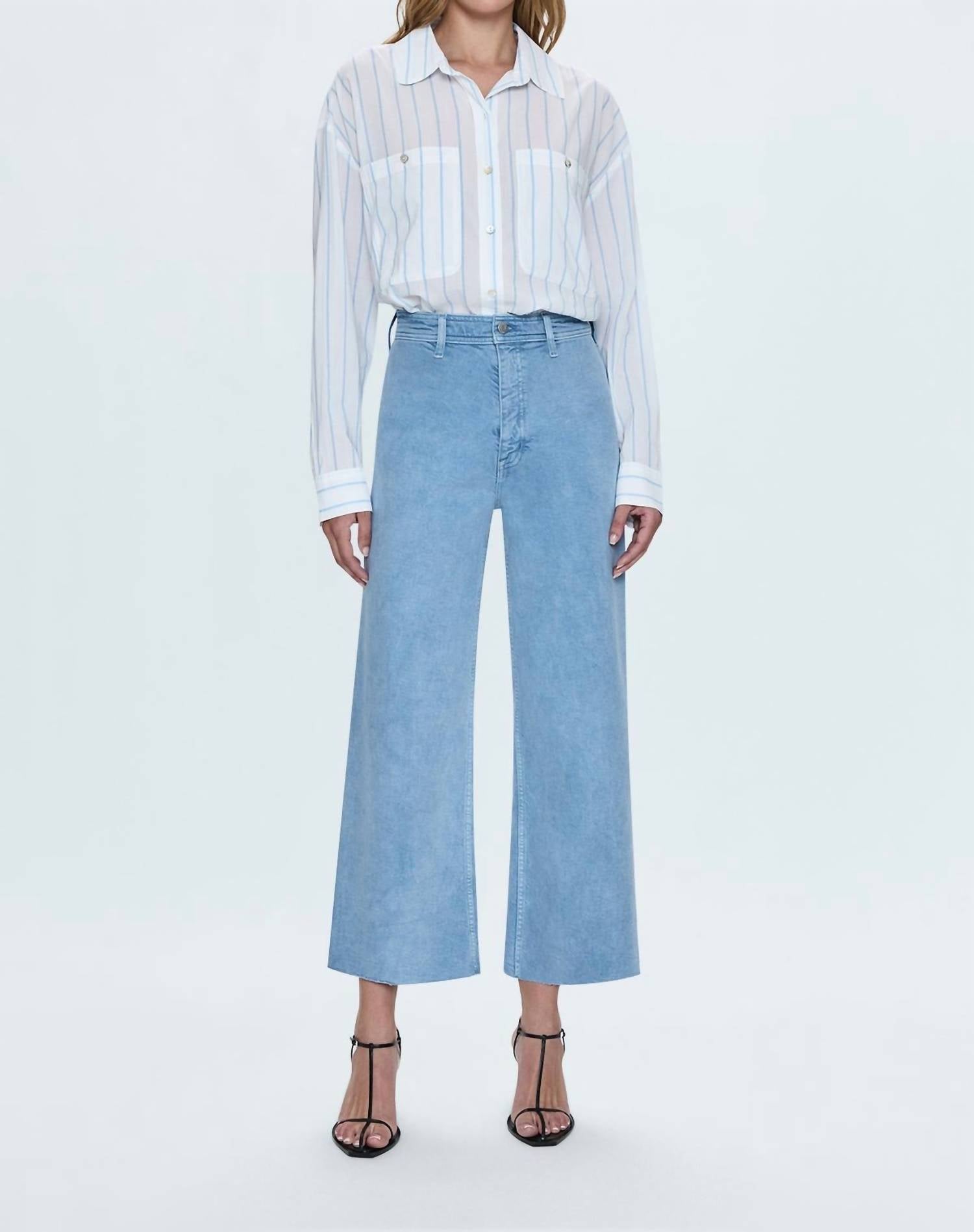 Tão fofos quanto confortáveis. Eleve o seu estilo jeans com a Calça Jeans Penny High Rise Crop Wide Leg da PISTOLA em um tom frio Frost Blue. Esta calça jeans possui cintura alta, modelagem ampla e bainha curta na altura do tornozelo, além de um corte tesoura para um acabamento despojado. Confeccionada em 99% algodão e 1% elastano, esta calça jeans com elastano e conforto oferece um caimento perfeito com 30 cm de altura, 53 cm de abertura nas pernas e 68 cm de costura interna. O fechamento é prático com botões e o cuidado é simples, com instruções de lavagem à máquina; importada para um toque de estilo internacional. A modelo tem 1,75 m e veste tamanho 26.