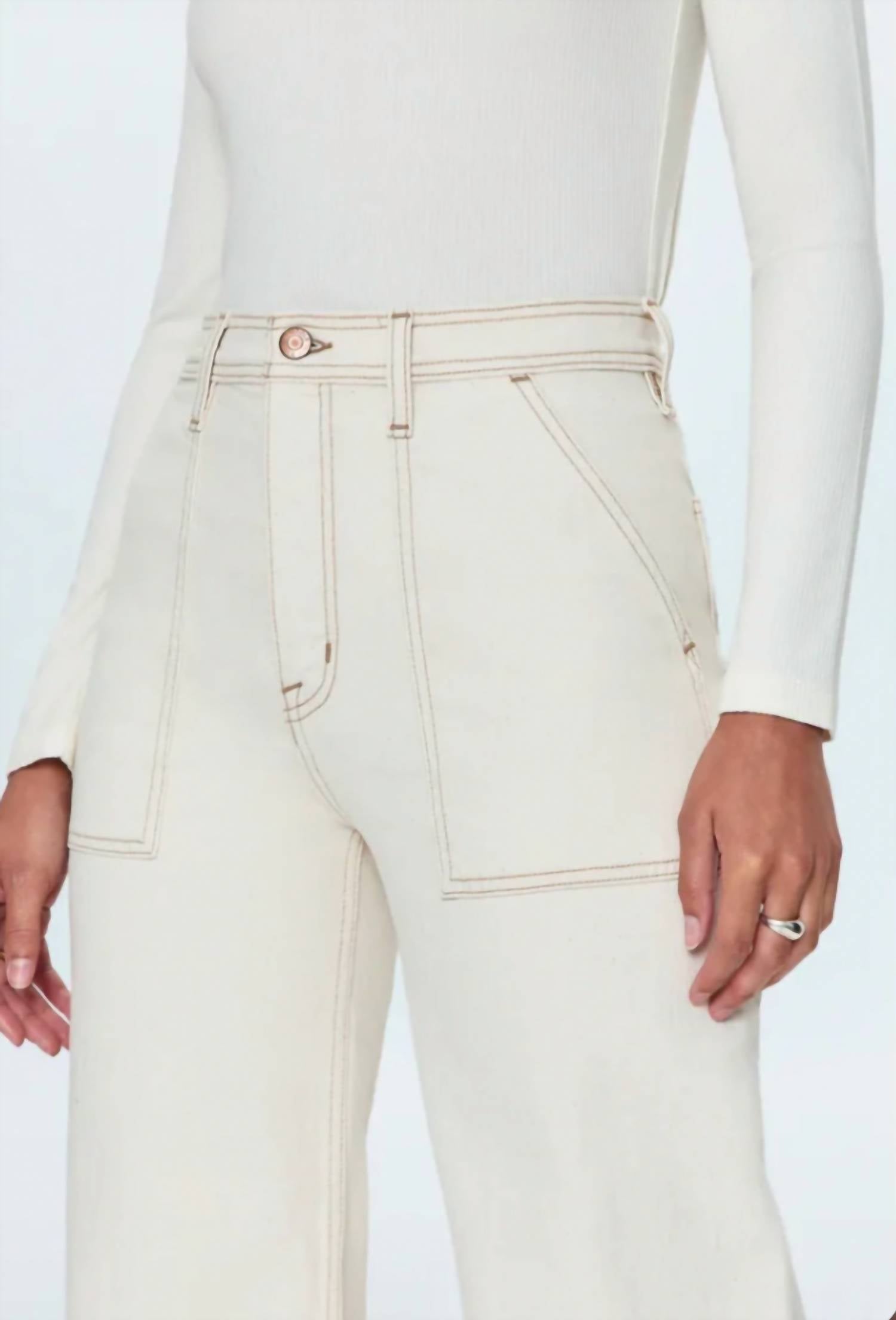 Cintura alta, pernas largas, bolsos frontais e bainha longa de 81 cm. Confeccionada em jeans stretch confortável, exclusivo da marca, com cós com costura dupla e acabamento na bainha dos punhos costurados. O Ecru é um jeans quente, de cor off-white, caracterizado por costuras marrons contrastantes em toda a peça e acabamento com detalhes em cobre.