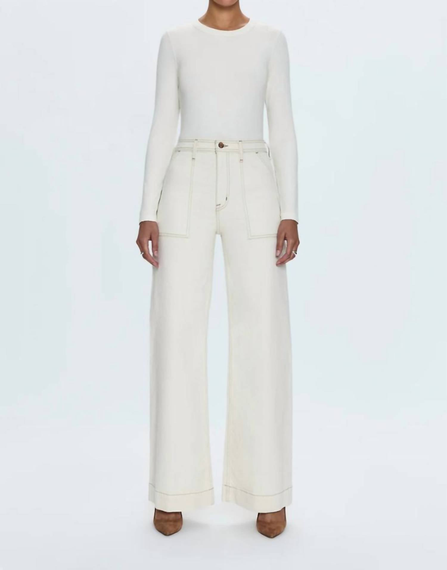Abrace a elegância e a utilidade com a Calça Jeans Penny Utility da PISTOLA, agora disponível em um sofisticado tom cru. Esta calça jeans feminina de cintura alta tem um caimento relaxado e pernas largas que valorizam o corpo, além de bolsos práticos. Confeccionada em uma mistura de algodão durável, 99% algodão e 1% elastano, ela foi desenvolvida para conforto e estilo. O fechamento é feito com um botão e seu padrão sólido a torna ideal para o streetwear de primavera ou ocasiões de férias.