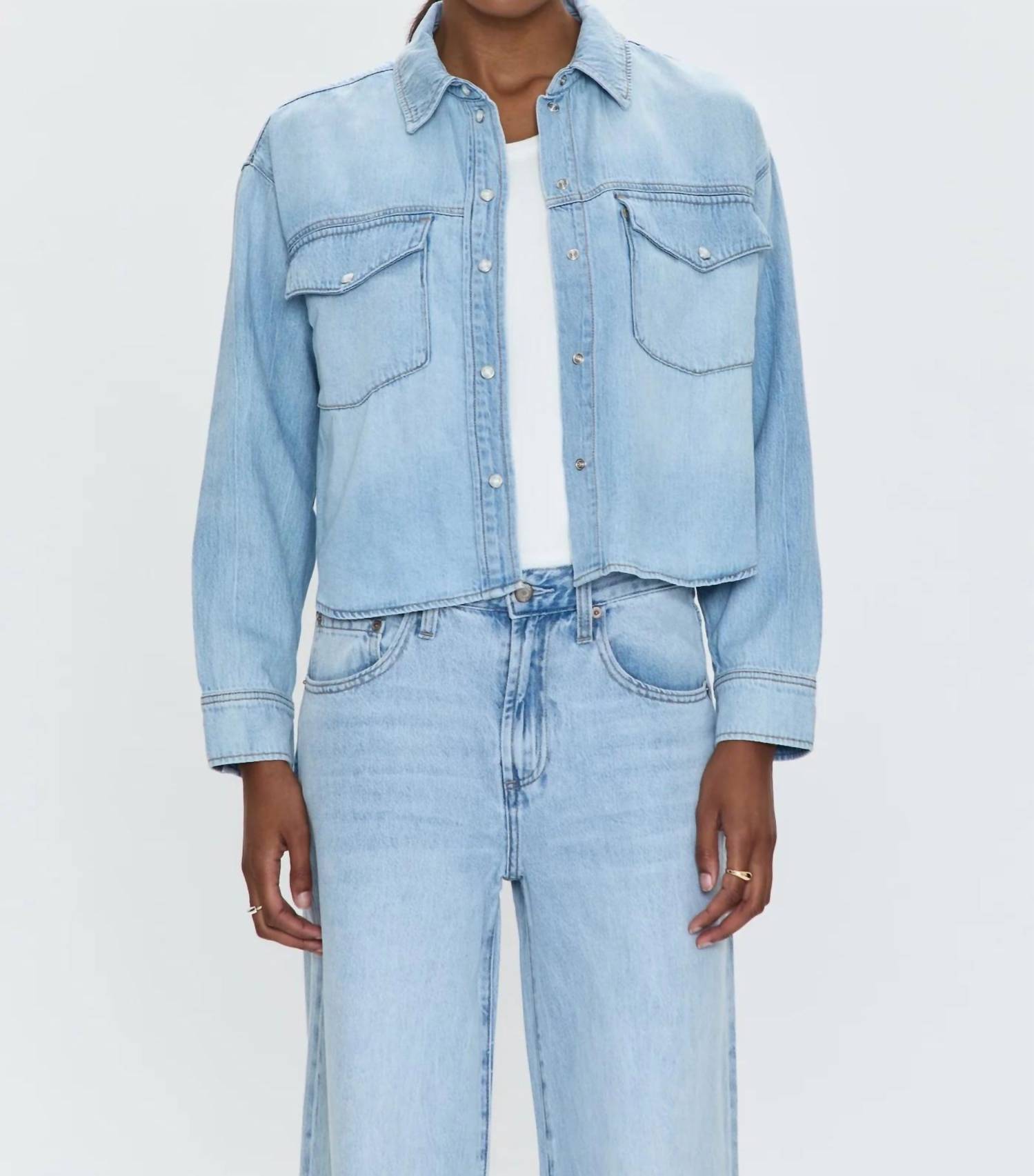 Uma camisa clássica de botões que nunca sai de moda. Apresentamos a Camisa Sadie Classic Workwear da PISTOLA, uma peça versátil perfeita para qualquer guarda-roupa. Confeccionada em 100% algodão, esta camisa de manga comprida e botões, de tecido liso, possui uma gola elegante e bolsos frontais no peito, tornando-a uma escolha elegante para o trabalho ou viagens. Com um comprimento perfeito, ela pode ser usada por dentro ou por fora com seu jeans favorito. Produzida com materiais importados, suas instruções de fácil cuidado recomendam lavagem à máquina em água fria.