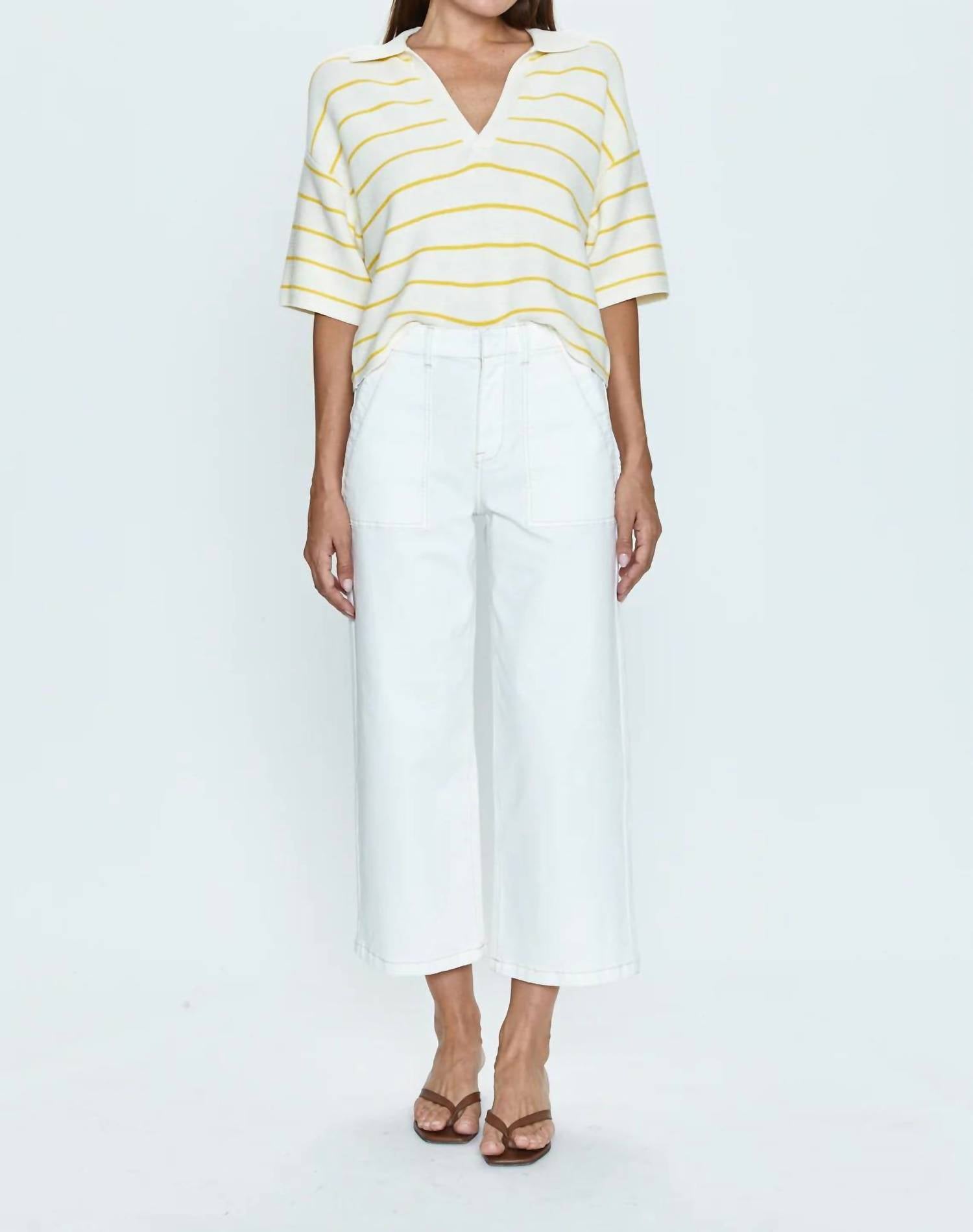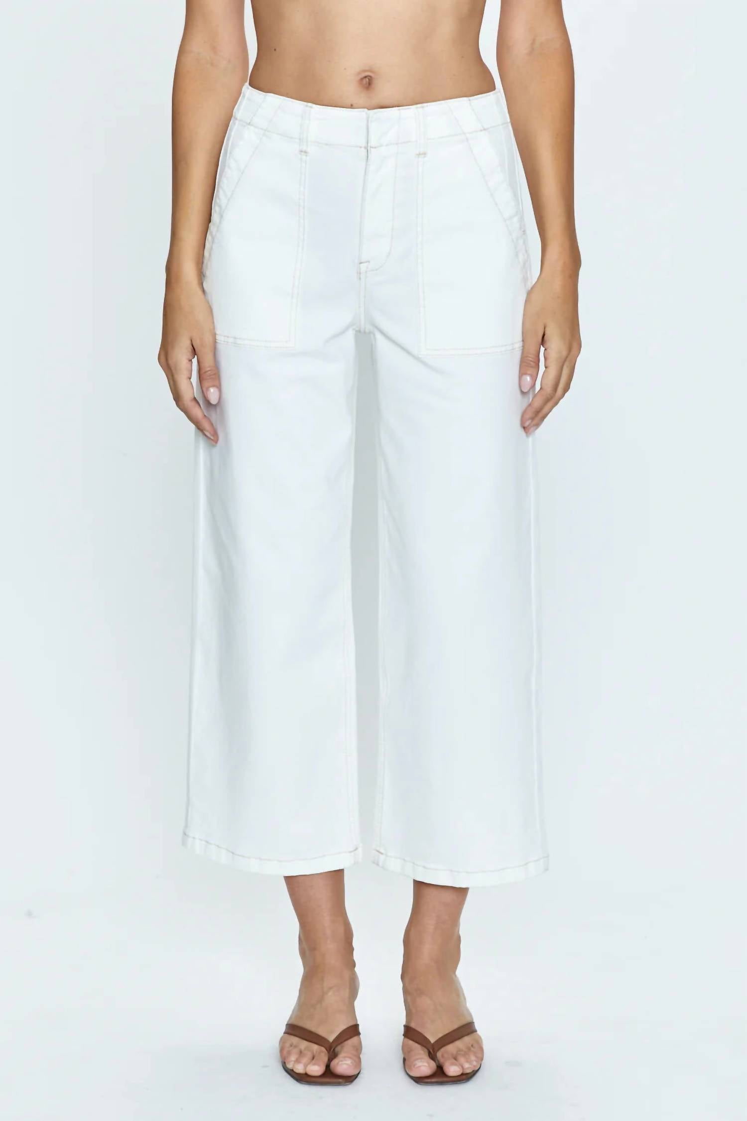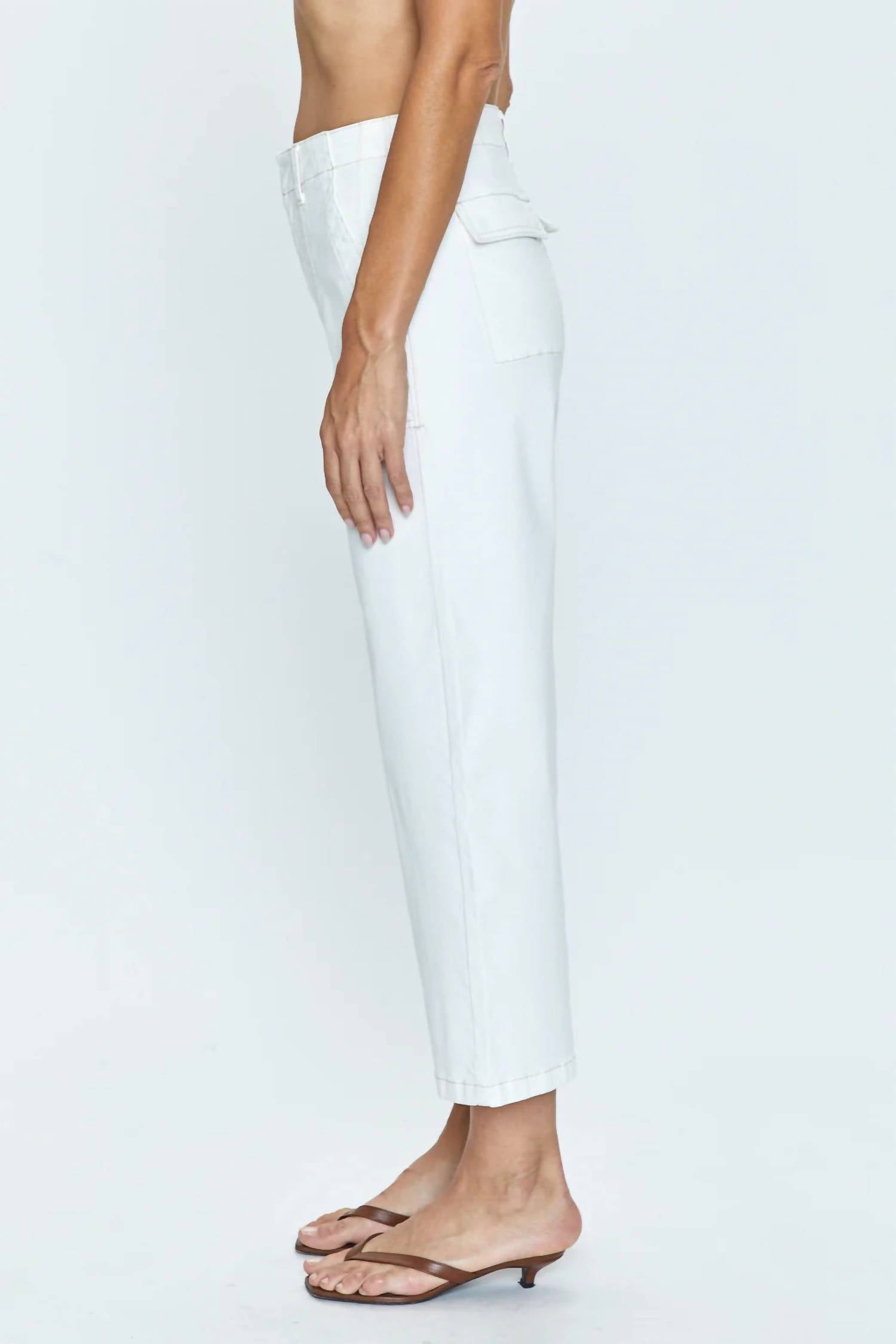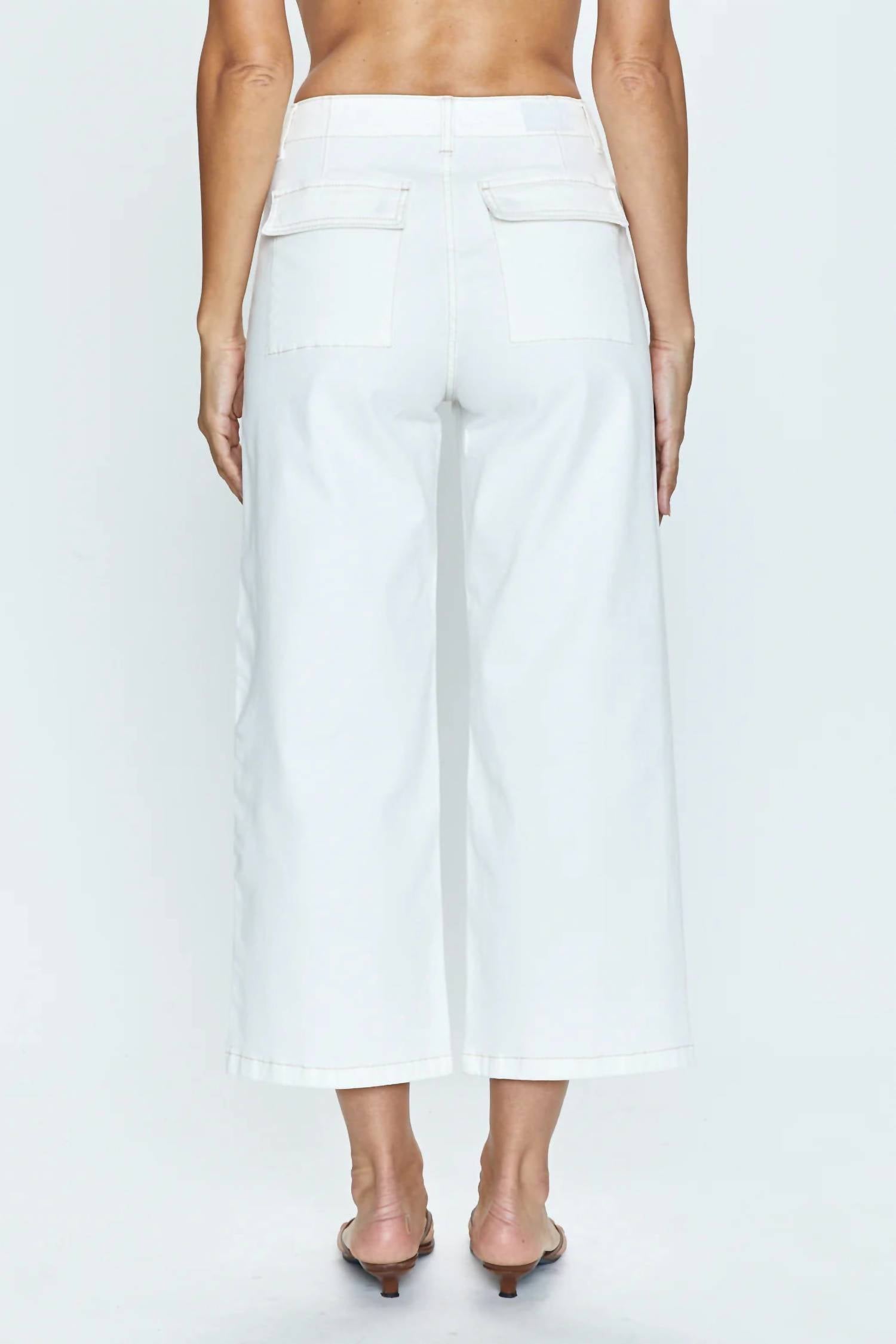 A Calça Utilitária Sophia Wide Leg da PISTOLA é um complemento chique para qualquer guarda-roupa, perfeita para um visual minimalista em sua cor sólida "le blanc". Confeccionada em uma confortável mistura de 98% algodão e 2% elastano, esta calça importada apresenta um corte relaxado e largo, com cós alto de 30 cm, costura interna de 67 cm e abertura de 50 cm. Projetada com praticidade em mente, inclui bolsos frontais aplicados e bolsos traseiros com aba e botão, realçados por um prático fecho de zíper. Cuide desta calça estilosa com uma simples lavagem à mão. A modelo tem 1,75 m e veste tamanho 66.