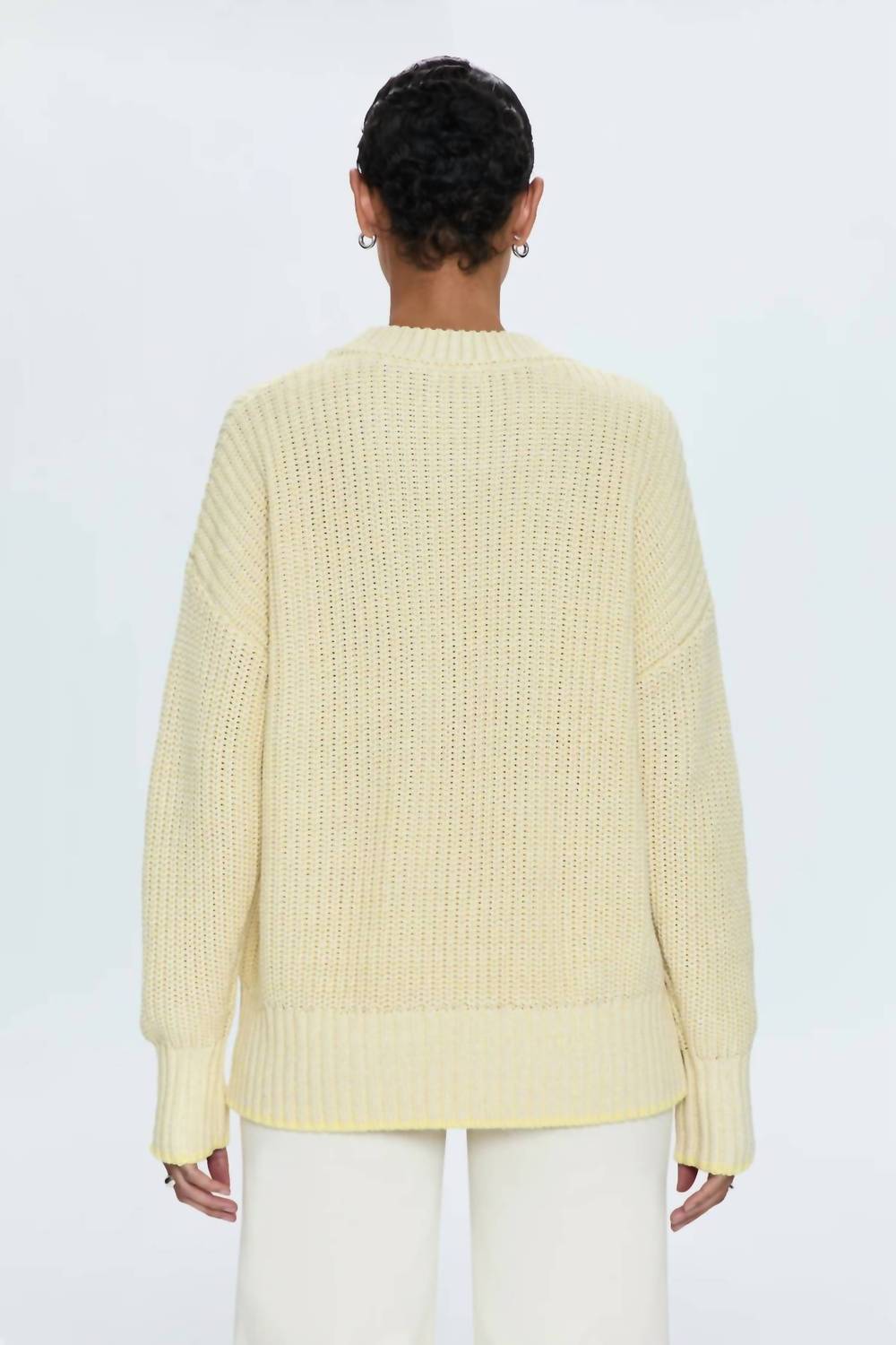 Mantenha-se aquecido e estiloso com esta peça essencial de tricô versátil e despojada. Use-o sozinho ou em camadas, é o suéter perfeito para a estação e você vai desejar tê-lo em todas as cores. Incremente seu guarda-roupa com o suéter Tina Pullover da PISTOLA, um belo exemplo de textura e conforto em amarelo suave. Esta peça apresenta um padrão de malha waffle, mangas longas e um decote redondo clássico, complementado por punhos e bainha canelados. Confeccionado em 100% algodão, oferece um caimento respirável e confortável, perfeito para passeios casuais. Com um design prático e prático, é ideal para um estilo fácil. Cuidados: Lavar à mão.