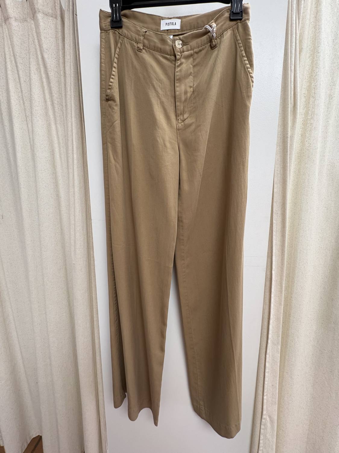 Ela tem cintura baixa e pernas largas, estilo palazzo. É confeccionada em um tecido leve e arejado que flui com o movimento. O tom cáqui suave é perfeito para looks mais formais ou informais. 100% Tencel.