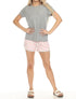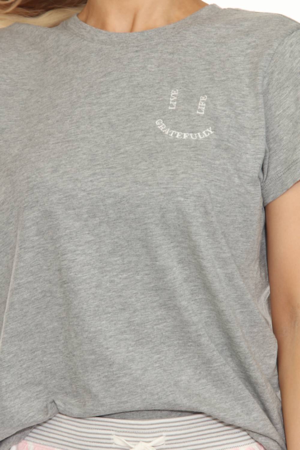 Elevate your nighttime routine with the Live Life Gratefully Short Pajama Set by PJ Salvage, crafted for ultimate comfort and style. This women's set includes a short sleeve crewneck top and pull-on shorts, both made from an 81% Polyester, 14% Rayon, and 5% Elastane Peachy Jersey blend. Designed in a charming Pink Dream and Grey color scheme, the set features an elastic waist with a drawstring for a customizable fit. Imported and machine washable, it is also suitable for tumble drying, ensuring easy care and maintenance.