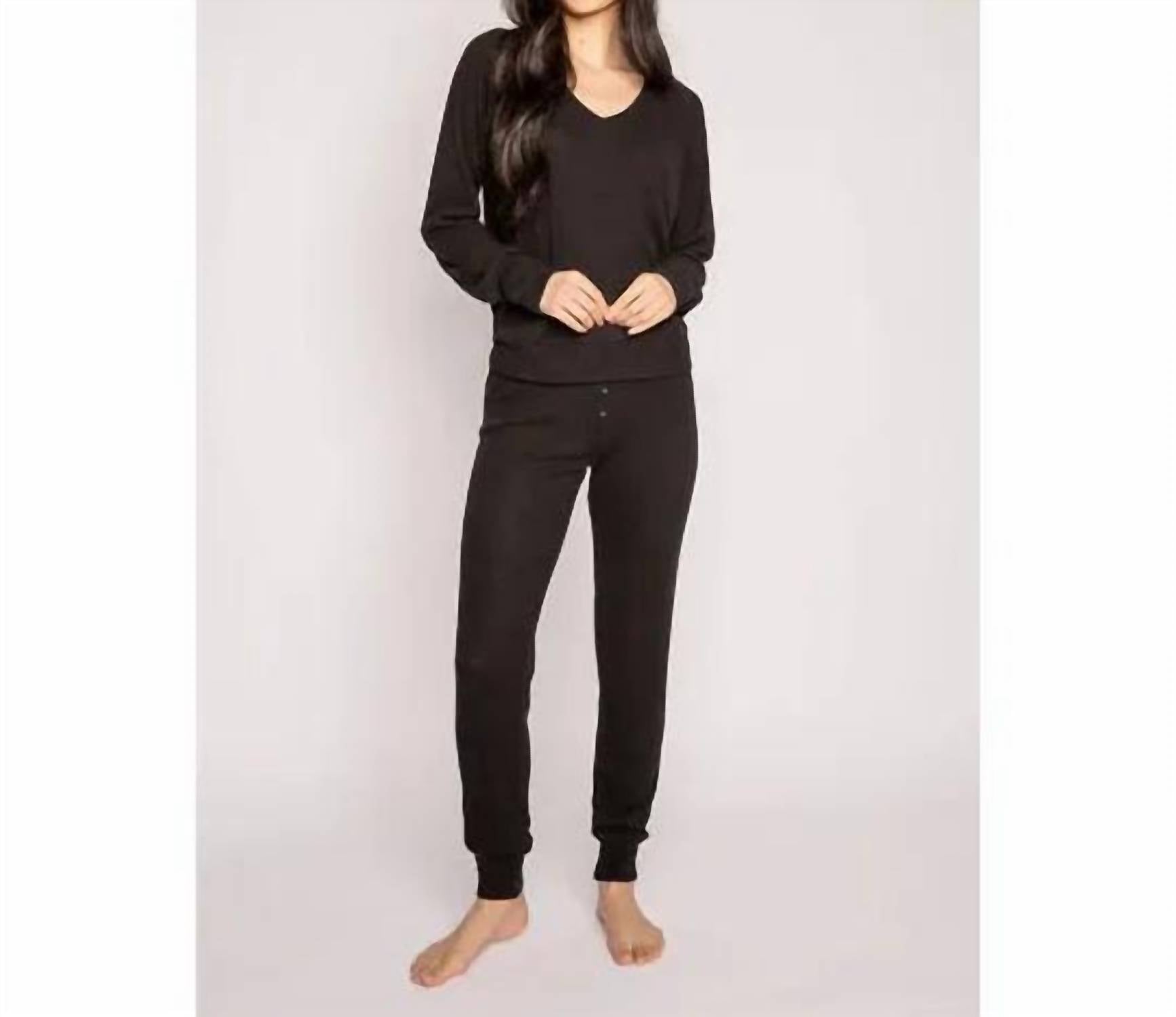 Conheça o Conjunto de Pijama Textured Basics da PJ Salvage, confeccionado para conforto incomparável em canelado macio 2x2. Este conjunto de pijama apresenta um top decote em V relaxado, mangas compridas e calças de pijama com faixas. Feito de uma mistura de rayon, poliéster e 5% elastano, ele foi desenvolvido para um ajuste confortável. Cuidados: Lavar à máquina com água fria, do avesso, não usar alvejante e secar na horizontal. A modelo tem 1,78 m e veste tamanho P.