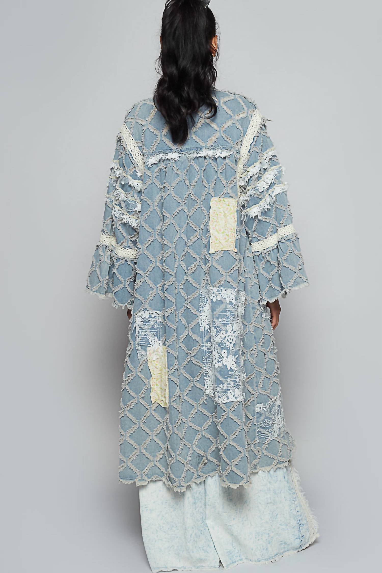 Use esta jaqueta adorável sobre praticamente qualquer coisa para um visual estiloso e sem esforço. Este cardigan com decote em V apresenta mangas largas e caimento solto, confeccionado em jeans com detalhes de inspiração vintage. Renda e apliques estampados, pontos de acabamento, bordas cruas e detalhes de costura externa adicionam um toque único, enquanto um padrão quadrado texturizado realça o visual. Com acabamento em lavagem vintage e confeccionado em 100% algodão, oferece conforto e estilo marcante.