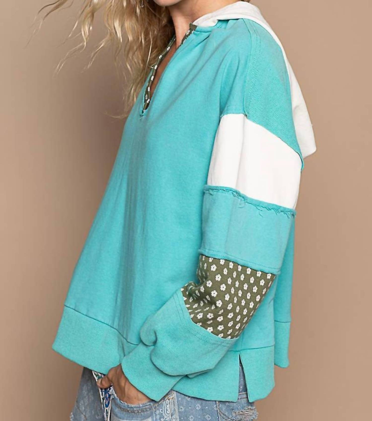 Não importa se você está correndo pela cidade ou relaxando em casa, este moletom serve para ambos. Conheça o moletom com capuz e decote em V com estampa de balões florais da POL, uma adição estilosa e confortável a qualquer guarda-roupa. Este moletom azul Tiffany possui mangas compridas e caimento solto, confeccionado em algodão macio. Destaca-se pelo patchwork floral de inspiração vintage e pelo design em blocos de cores. Com fecho de pressão, é fácil de cuidar, seguindo as instruções de lavagem à máquina e secagem em secadora.