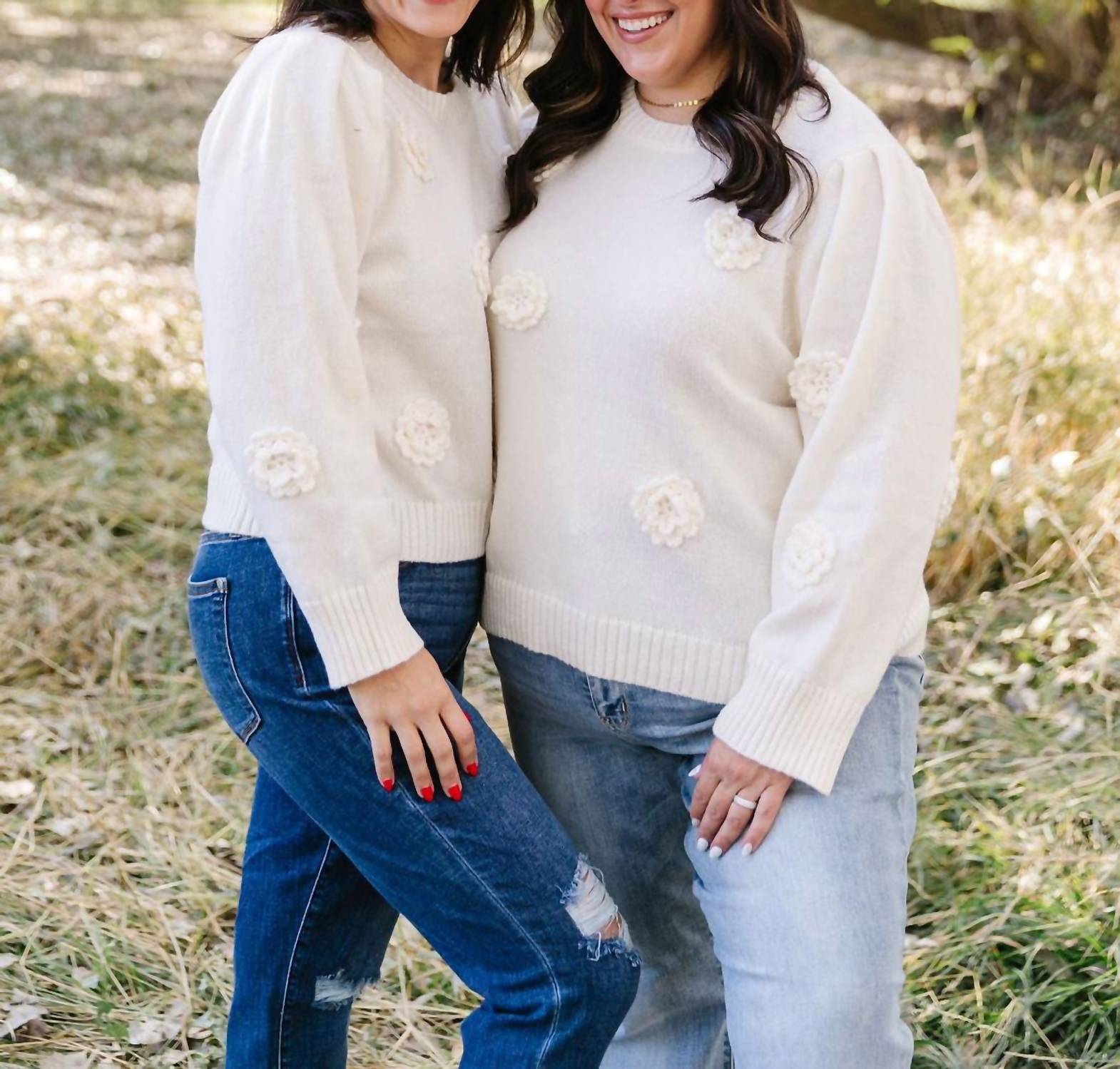Introducing the Polagram Berkley Long Sleeve Sweater, a minimalist yet stylish addition to your fall wardrobe. Crafted from 100% polyester, this cream sweater boasts beautiful floral appliques and trendy puff sleeves for a feminine touch. With a practical pull-on closure, it offers a comfortable fit while maintaining a chic look. Care: Hand wash cold separately, lay flat to dry, low iron if needed or dry clean. Lengths range from 21" to 24.5", and bust sizes from 34" to 50", ensuring a perfect fit for every silhouette.
