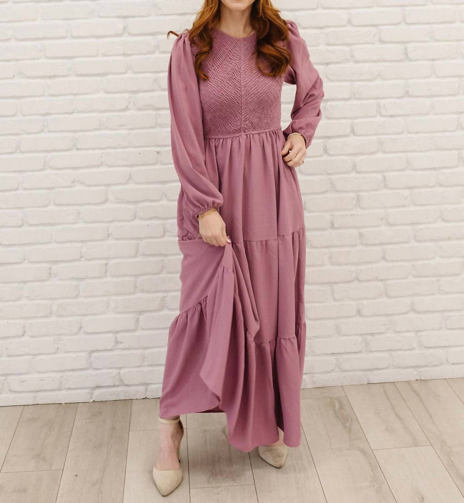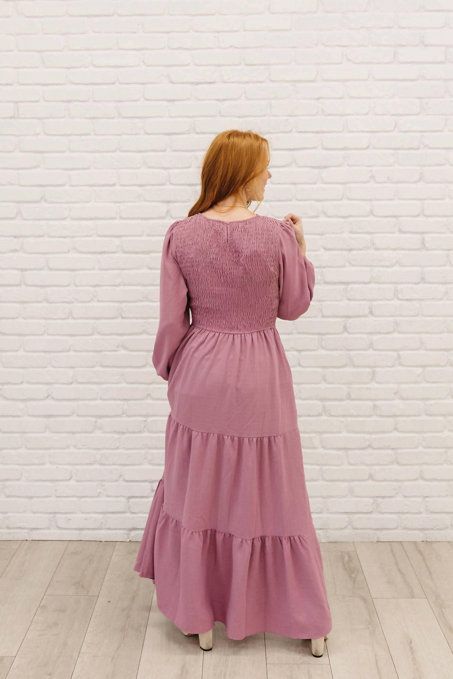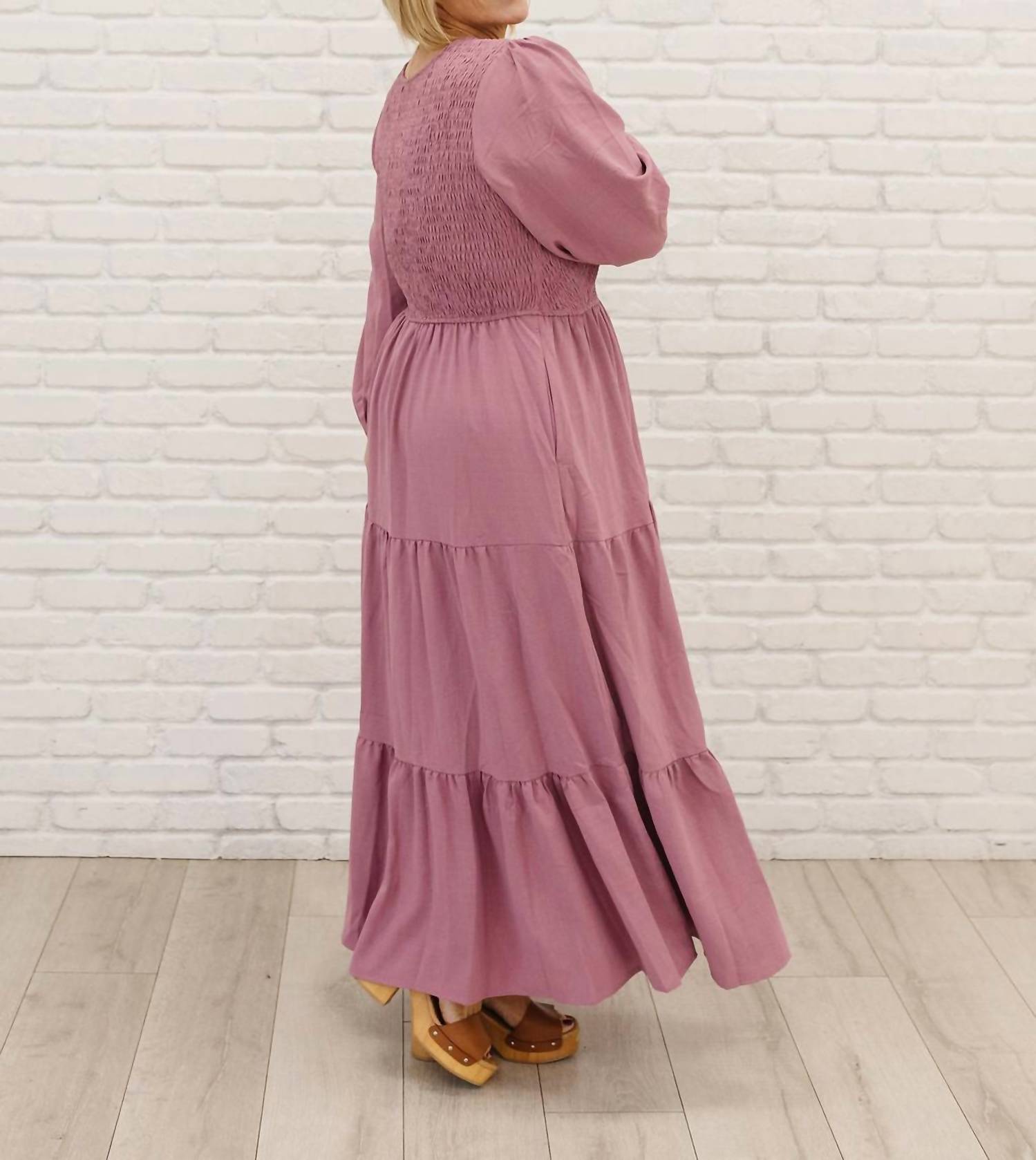 Style this maxi with your favorite statement necklace and sandals for the perfect look. Step out in style with the Polagram Isley Maxi Dress, a dusty rose beauty that captures attention at any gathering. This maxi dress features long sleeves with elastic cuffs and a smocked bodice with a tiered skirt, all brought together in an A-line silhouette. Crafted from 100% Rayon with a polyester lining, it offers both style and comfort and includes practical pockets for added convenience. Enjoy the ease of a pull-on closure, and for lasting elegance, hand wash cold and lay flat to dry. Model is 5'3" wearing size S: Length 54", Bust 32", Waist 28". Plus model is 5'7" wearing 1X: Length 55.5", Bust 44", Waist 38".