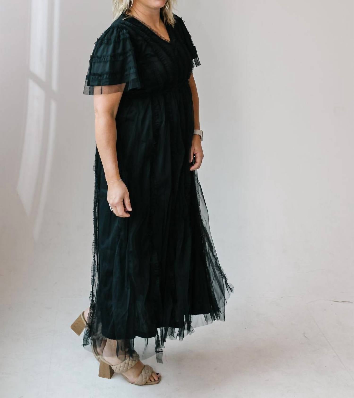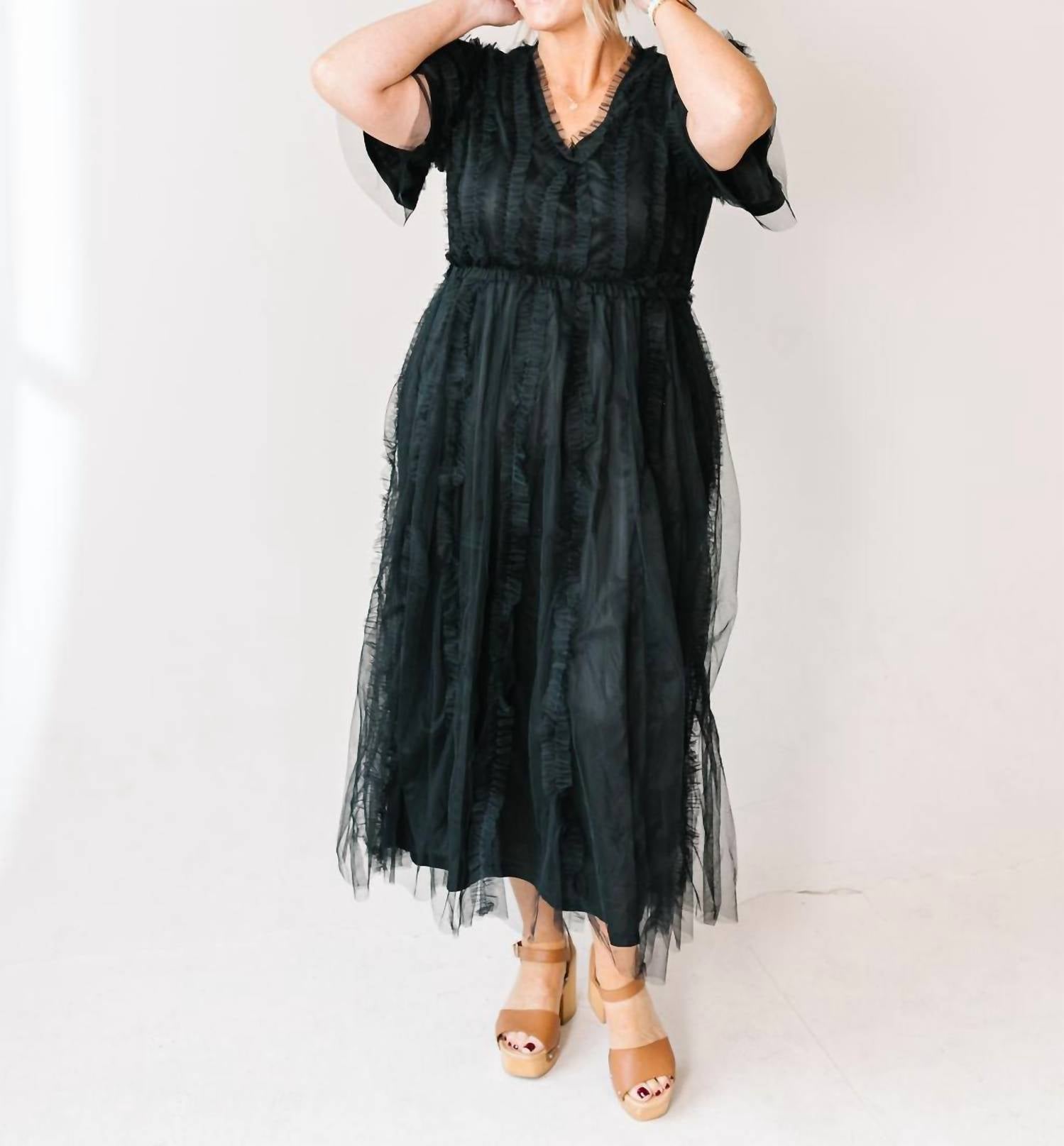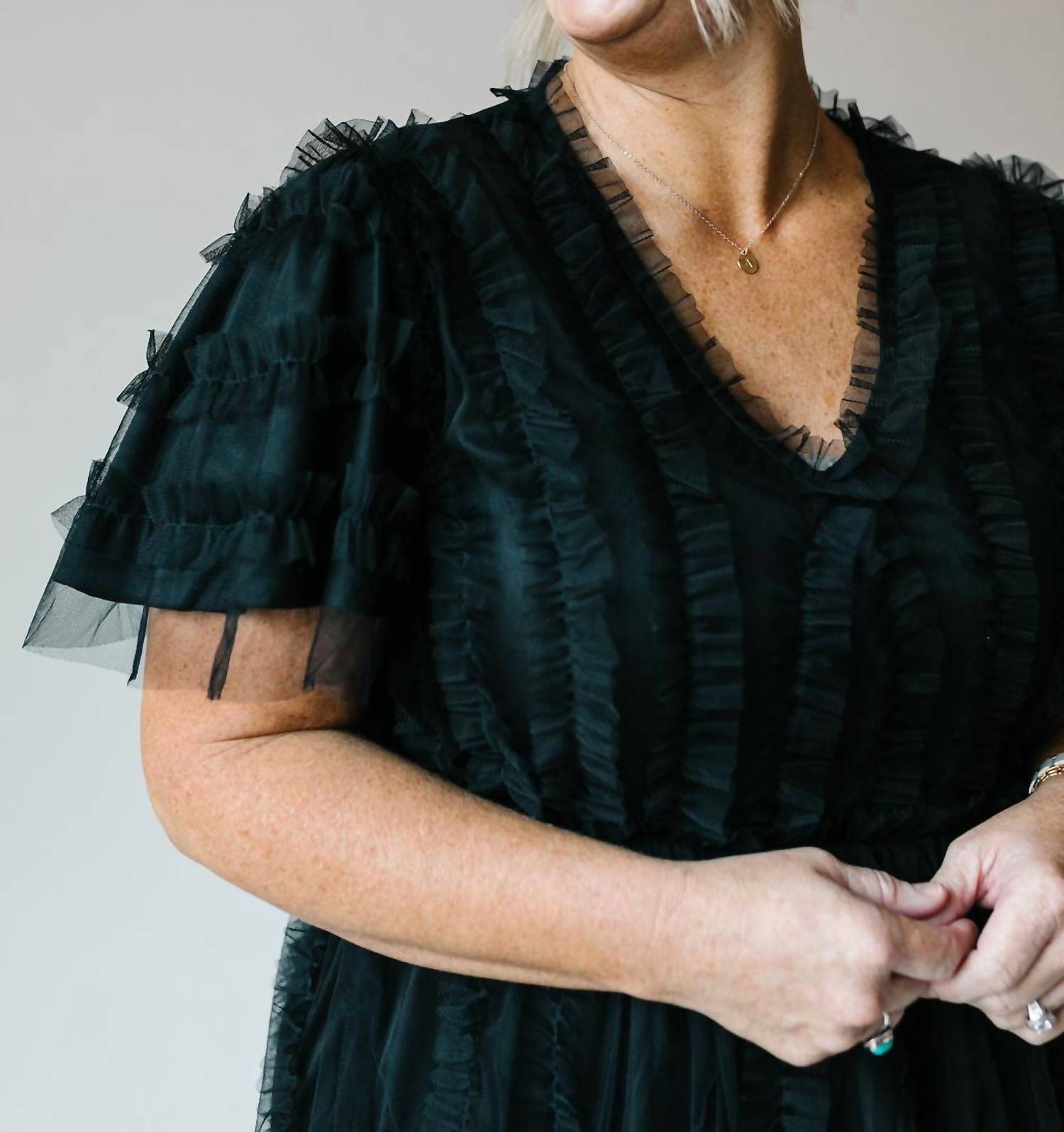 Step into elegance with the Jovi Maxi Dress by Polagram, a perfect choice for your next evening event. This A-line black tulle dress features short sleeves and a delicate V-neck, enhanced by an elastic waist and vertical ruffles for added charm. Crafted from 100% polyester, this pull-on design offers comfort and style, ensuring you stand out this New Year's Eve. For best care, hand wash cold, lay flat to dry, and low iron if needed. Model dimensions: Large model is 5'5", plus model in 1X is 5'7".