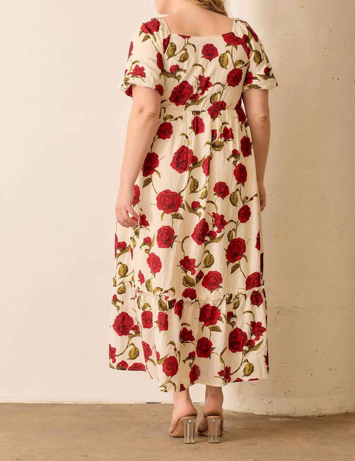 The Natasha Maxi Dress by Polagram is a captivating choice for any occasion, featuring playful short balloon sleeves and a flattering square neckline. Crafted from 100% Polyester, this A-line maxi dress showcases a stunning floral pattern with large red roses on a crinkly ivory backdrop. Designed for comfort and ease, it comes with a pull-on closure and is fully lined. Care for this elegant dress with a hand wash in cold water, laying flat to dry, and a low iron if needed. Model is wearing a size 2X at 5'11".