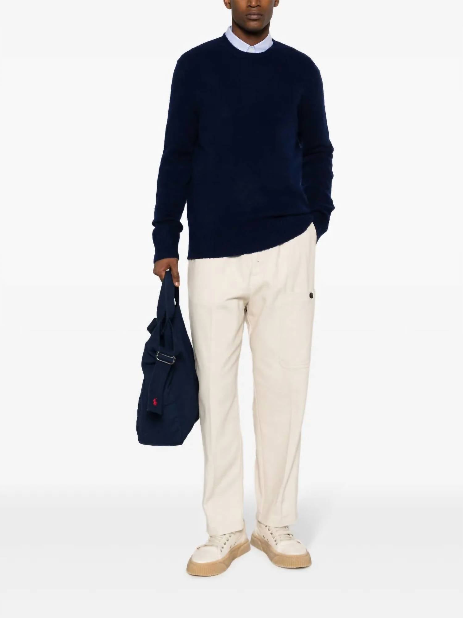 Embrace the sophistication of Polo Ralph Lauren with the Patch Crew Sweater, a winter essential for men in a rich imperial blue. This crew neck sweater is crafted from a luxurious 90% wool and 10% cashmere blend, showcasing a knitted construction with a brushed effect for added texture. It features elbow patches, long sleeves with ribbed cuffs, and a ribbed-knit edge for a polished look, finished with a straight hem. Care instructions recommend dry cleaning only to maintain its quality and comfort.