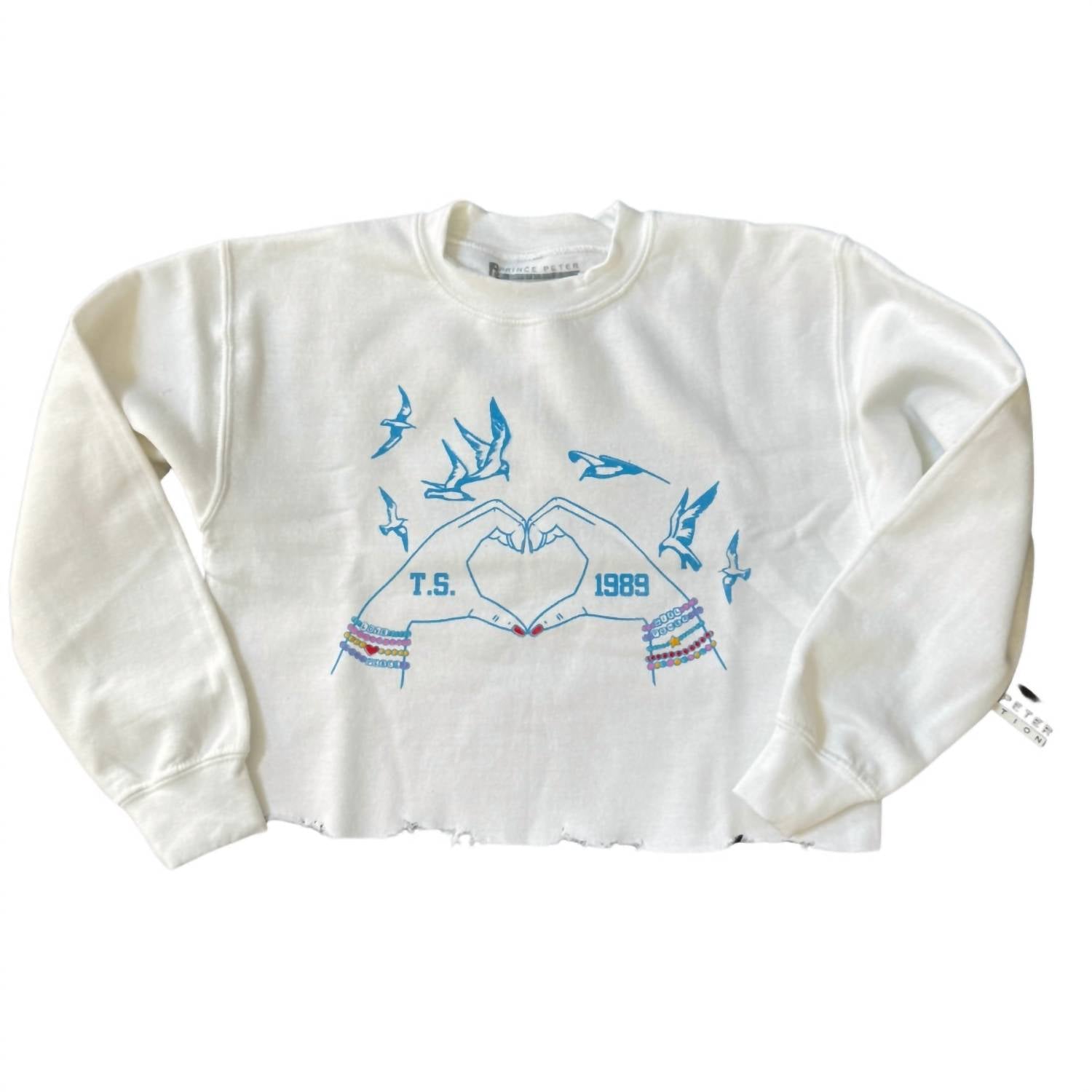 Discover the Girl's Ts Bracelet Crop Sweatshirt by PRINCE PETER, a stylish addition to any fall wardrobe. Designed in classic white, this sweatshirt features a graphic pattern that embodies a vintage trend, perfect for back-to-school and Thanksgiving events. Made from soft cotton, it offers comfort and style for every occasion. Care is hassle-free with machine wash and tumble dry instructions.