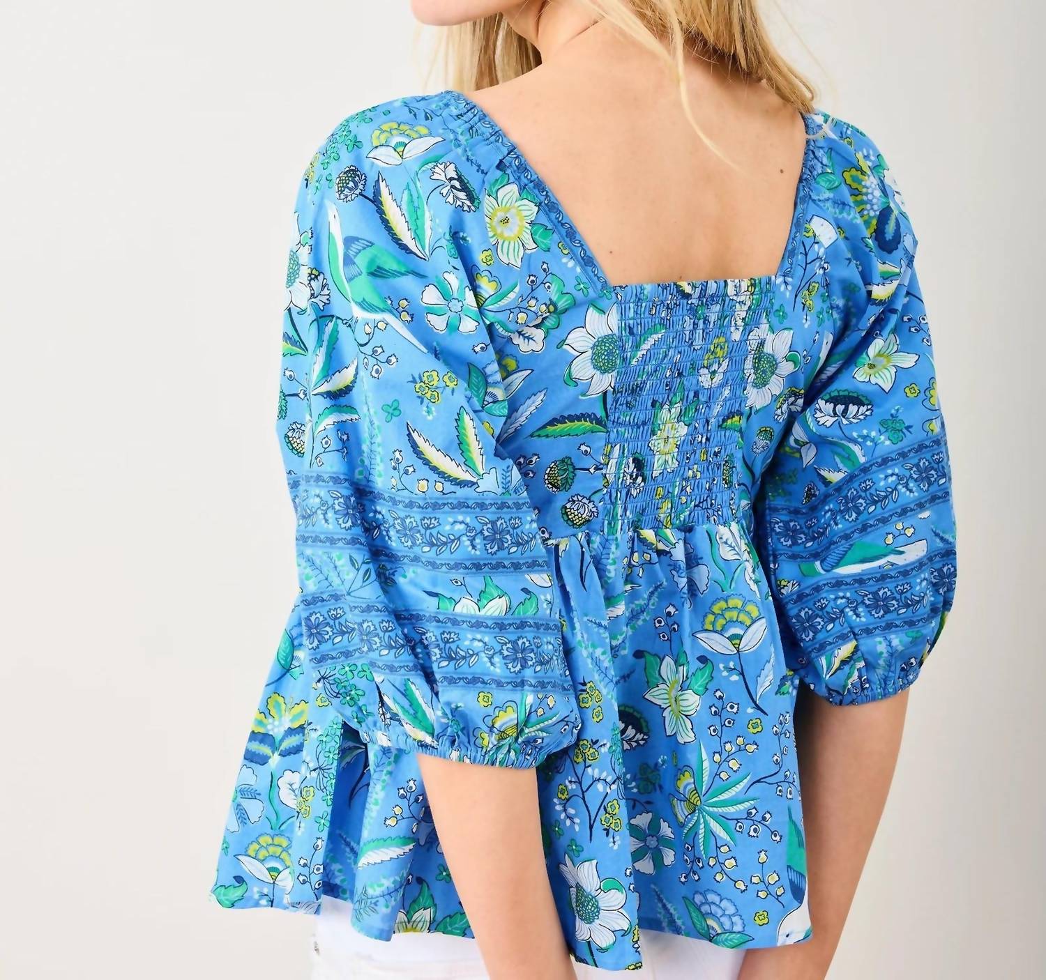 Descubra a Blusa Jasmine Garden da Printfresh, uma peça encantadora em azul, perfeita para qualquer guarda-roupa de férias. Esta blusa feminina tem mangas até o cotovelo e é confeccionada em cambraia 100% algodão orgânico, adornada com uma charmosa estampa floral. Com costas franzidas e punhos elásticos para um caimento feminino, ela é serigrafada à mão na Índia, unindo sustentabilidade e estilo. Fecho: Pull-on.