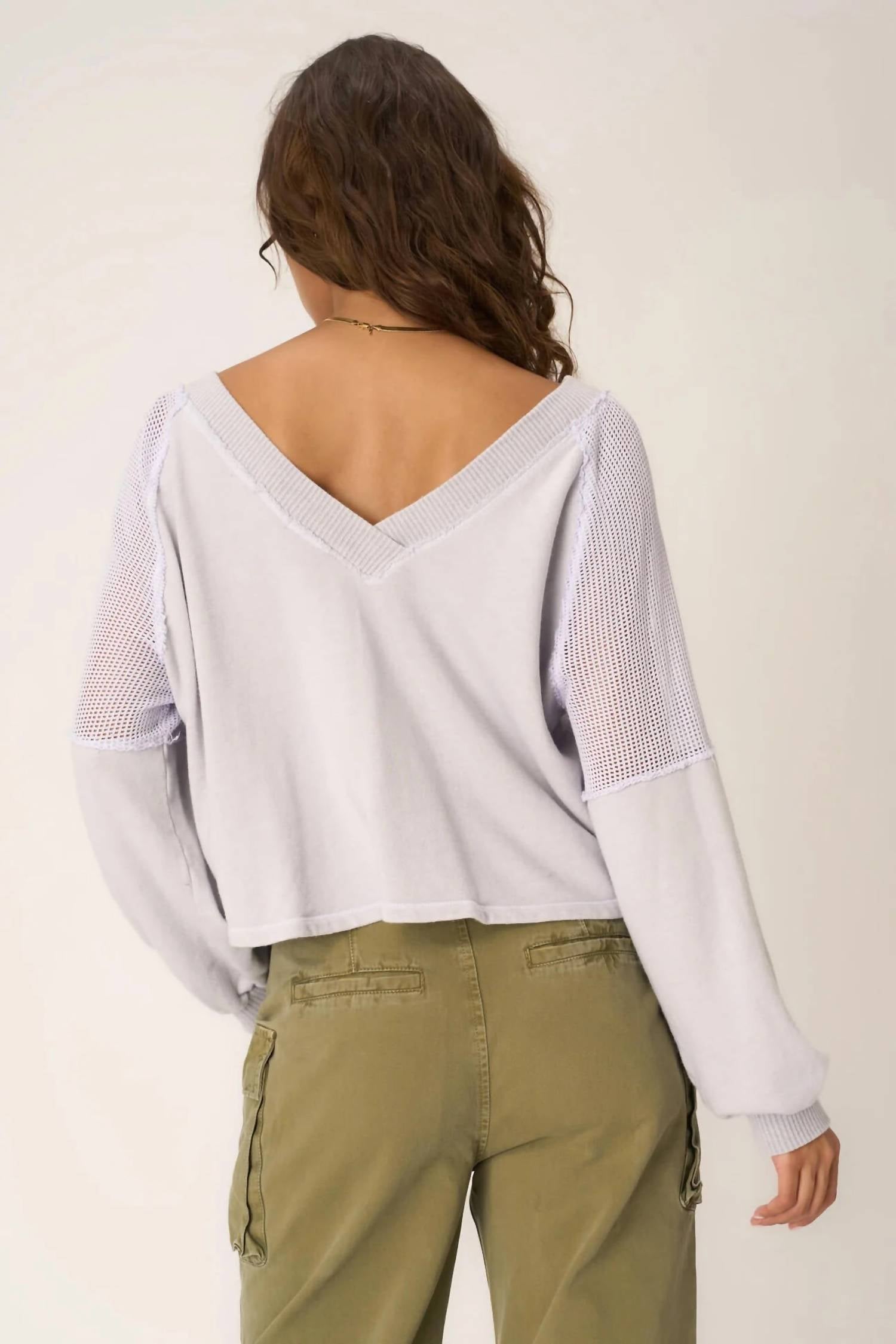 Meet the Harley Seamed V-Neck Pullover by PROJECT SOCIAL T, a chic addition to your casual wardrobe. This grey pullover showcases long mesh fabric sleeves paired with a lightweight fleece body, offering both style and comfort. Featuring an oversized v-neckline and back silhouette, along with contrast rib edging and banded cuffs, it's designed for a relaxed fit. Closure: Pull on. Please follow label instructions for care.