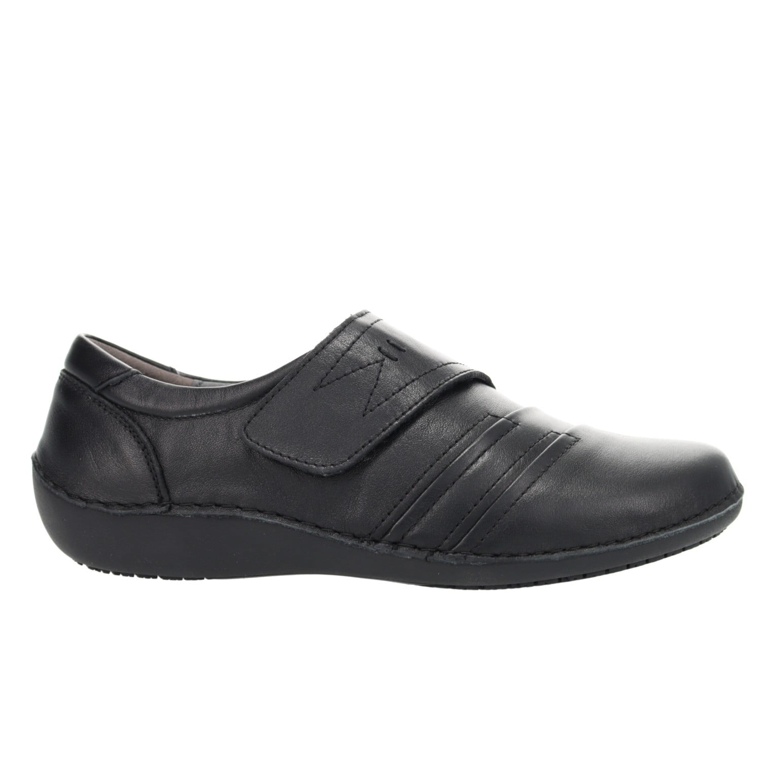 Cabedal todo em couro com fecho de velcro largo para calçar e descalçar com facilidade | O arco com suporte em espuma de PU de célula aberta de alta densidade permite que o ar flua para uma palmilha mais fresca e saudável | Couro | Altura do salto: 2,5 cm