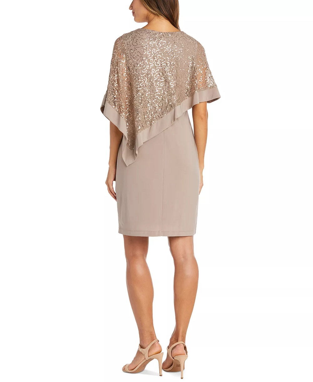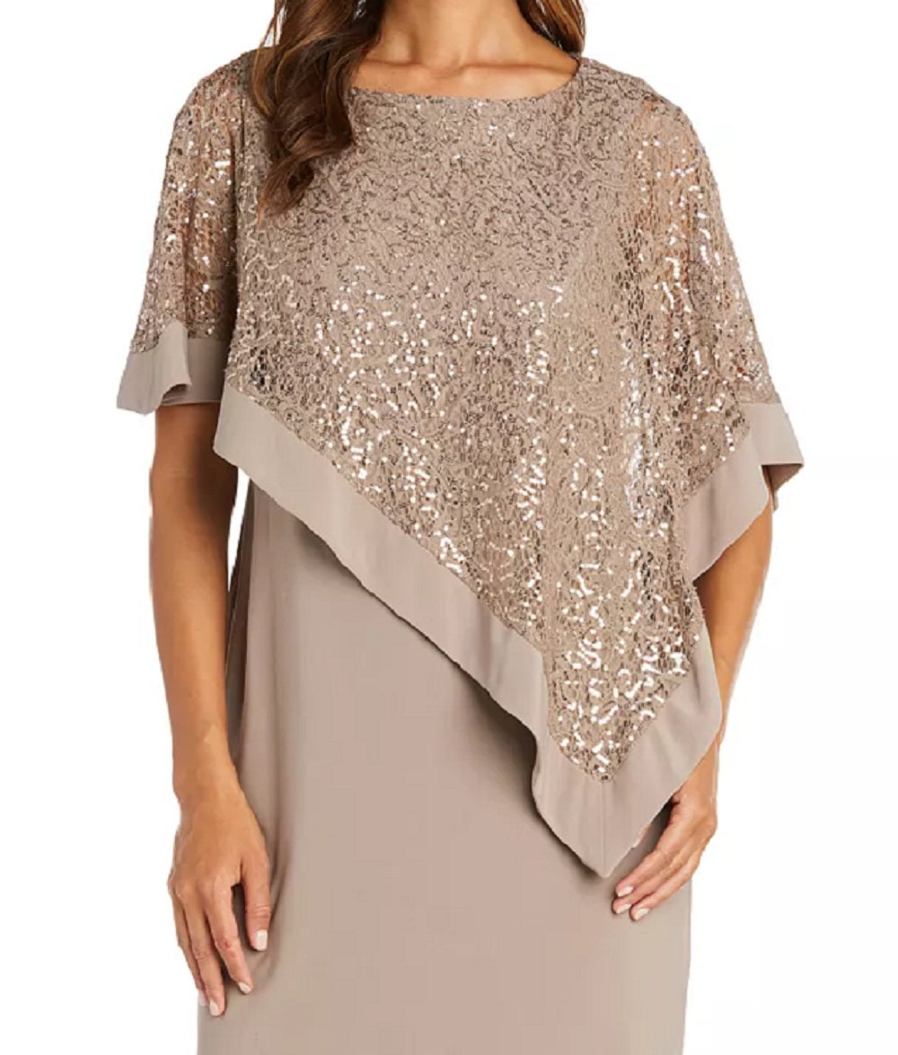 O vestido justo e justo da R & M Richards exala drama chique com um poncho sofisticado de renda com lantejoulas