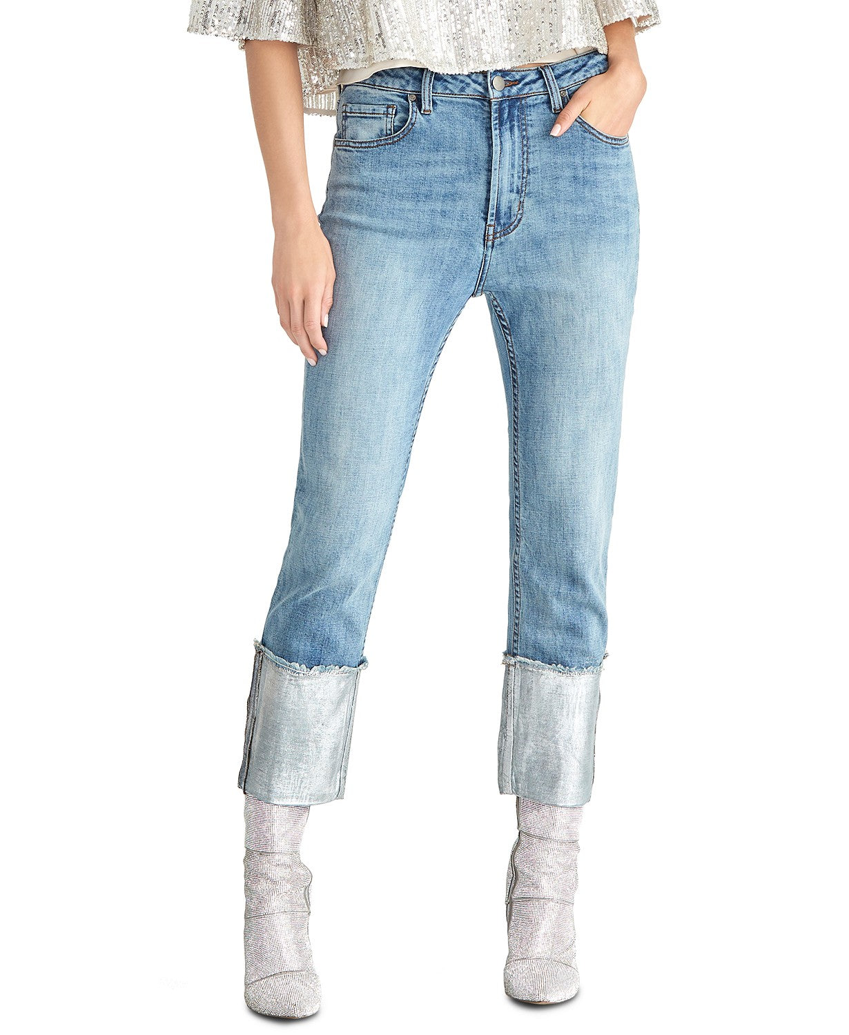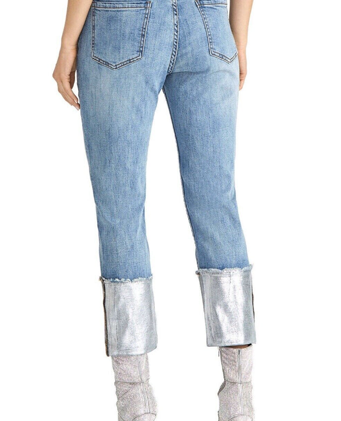 Comprimento interno aproximado: 25" | Cintura alta | Fecho de zíper e botão na frente; passantes para cinto | Revestimento metálico nos punhos