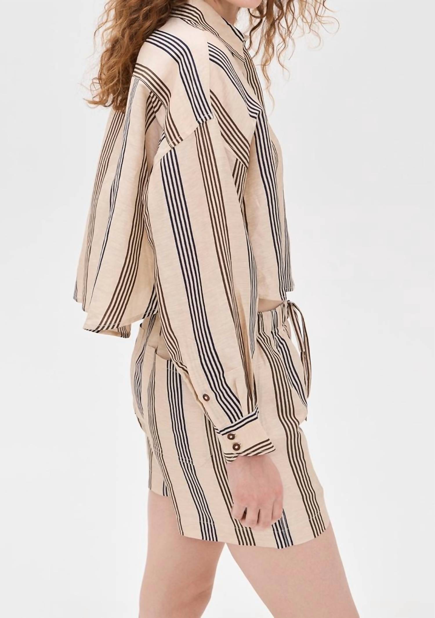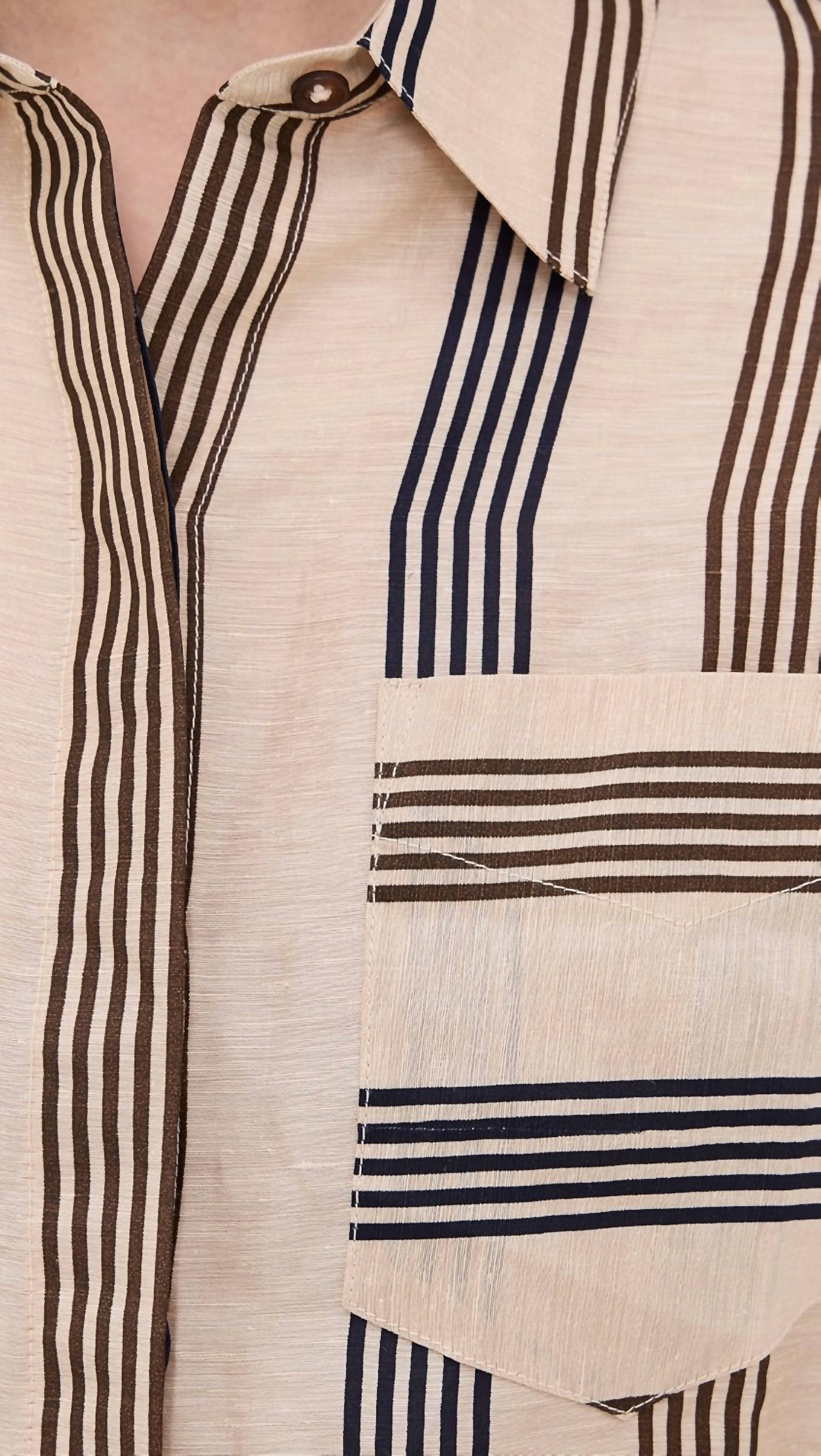 Eleve seu guarda-roupa com a Camisa Cropped de Linho "Beatrice" da Rag & Bone, uma peça chique confeccionada em um elegante padrão Creamstripe. Esta camisa feminina de botões apresenta mangas compridas com punhos abotoados e um prático bolso no peito. Apresenta uma composição luxuosa de 82% linho e 18% seda, importada da Indonésia, para um toque macio e respirável. O botão frontal oculto realça seu caimento relaxado, porém elegante. Cuidados: Lavagem a seco somente.