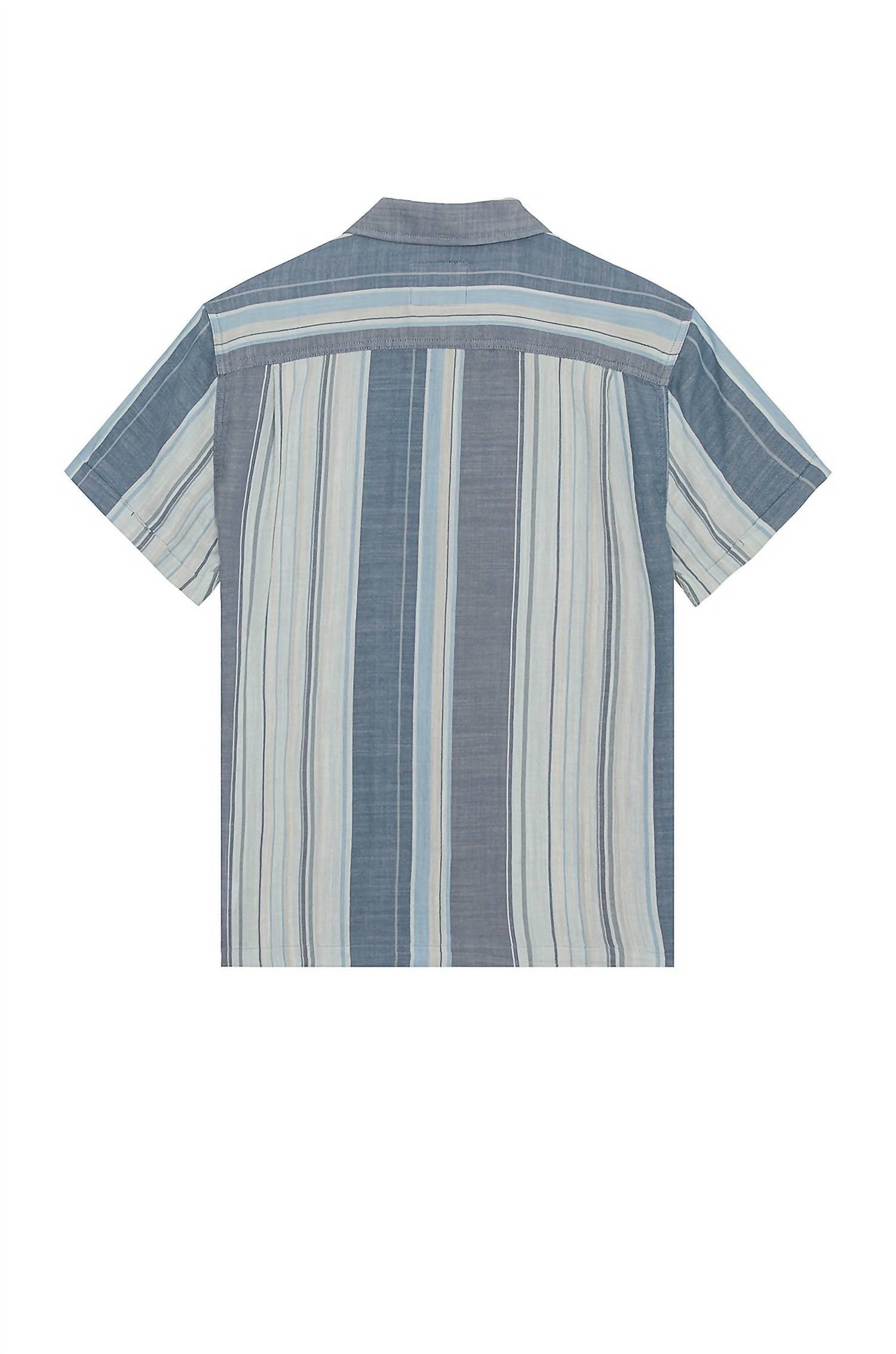 Crafted from 100% premium cotton. Lightweight and breathable shirt offers incredible comfort. Cool blue banner stripes evoke a laid-back, coastal vibe. Designed for men. Features a classic collar and a button closure for that timeless, easygoing look. Short sleeves enhance its relaxed feel. Ensures a sleek and modern silhouette. Effortlessly elevates your style with its crisp, elegant pattern and top-notch craftsmanship. Easy to care for, just toss it into the machine wash.