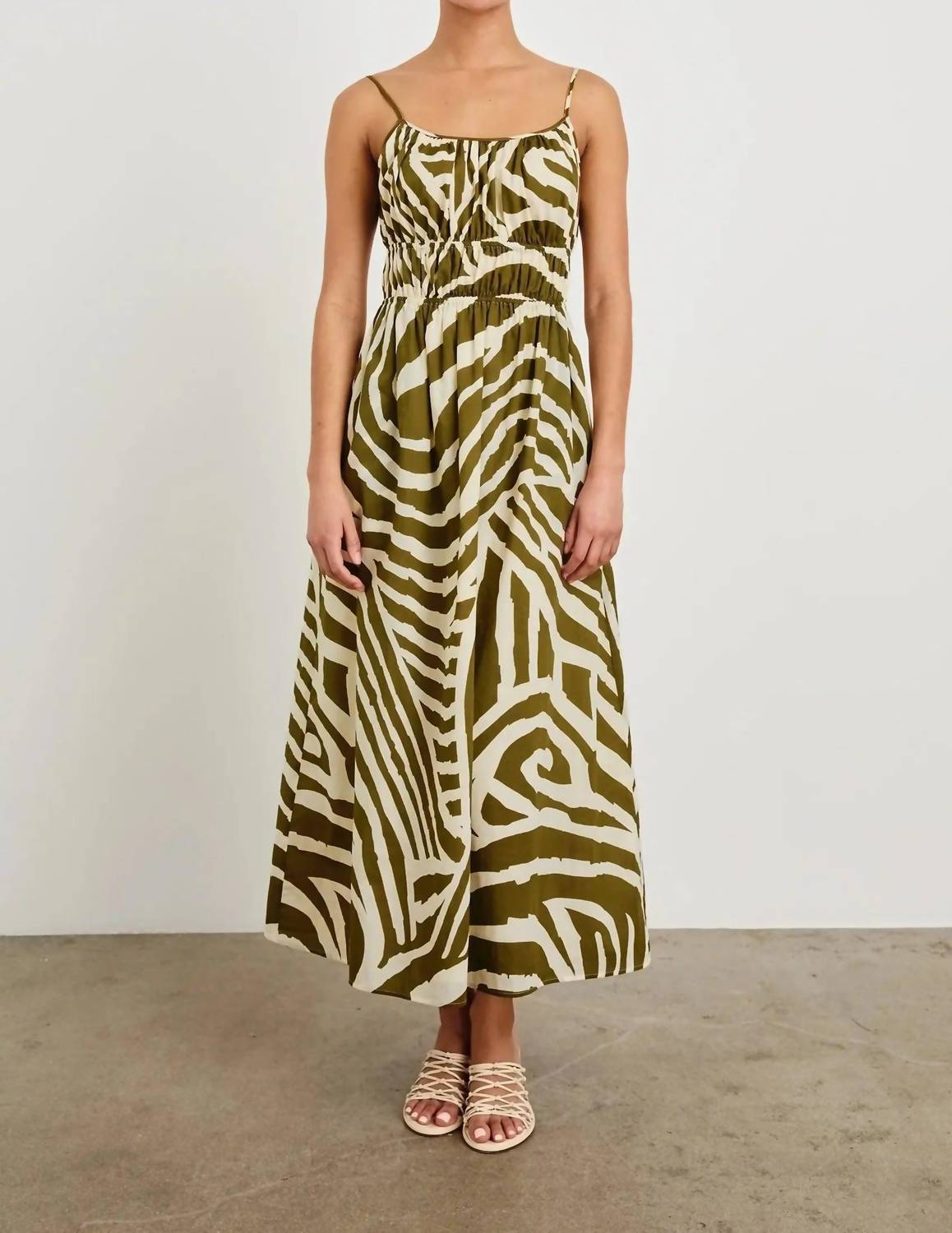 The perfect length dress does exist. Discover the Rails Fatima Dress in Selva, a beautifully patterned midi dress perfect for summer occasions. Crafted from breathable 100% cotton, this dress features spaghetti straps, a flattering smocked waist, and concealed side pockets for added convenience. With a garment length of 45 inches, it exudes elegance with a hand-painted botanical design. Closure: Pull on. For care, hand wash and lay flat to dry.