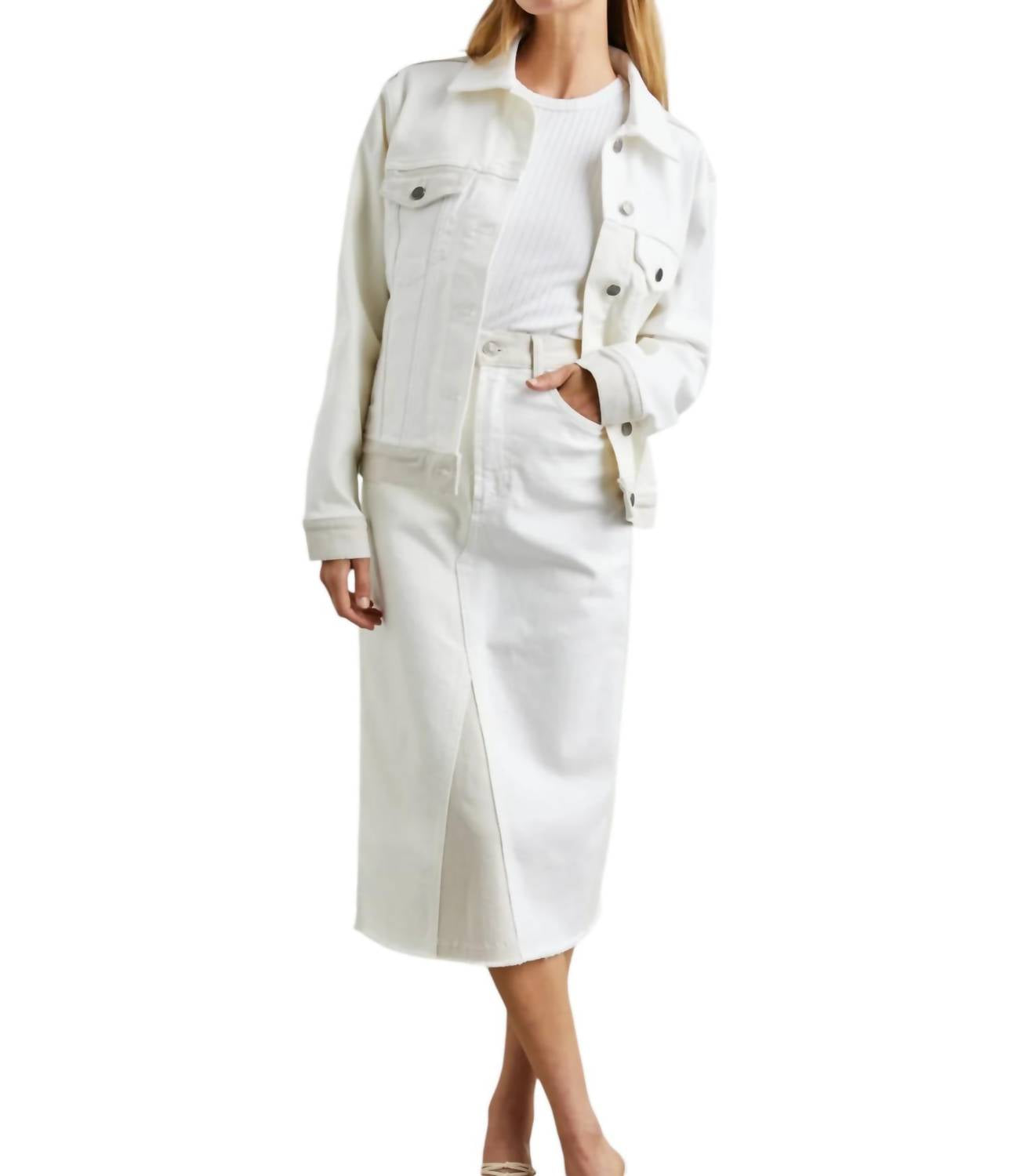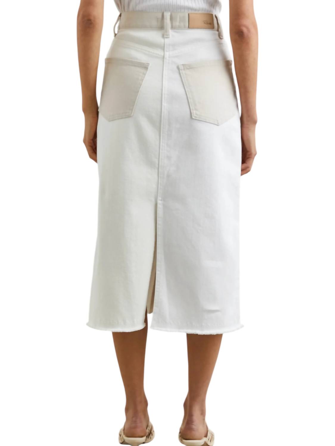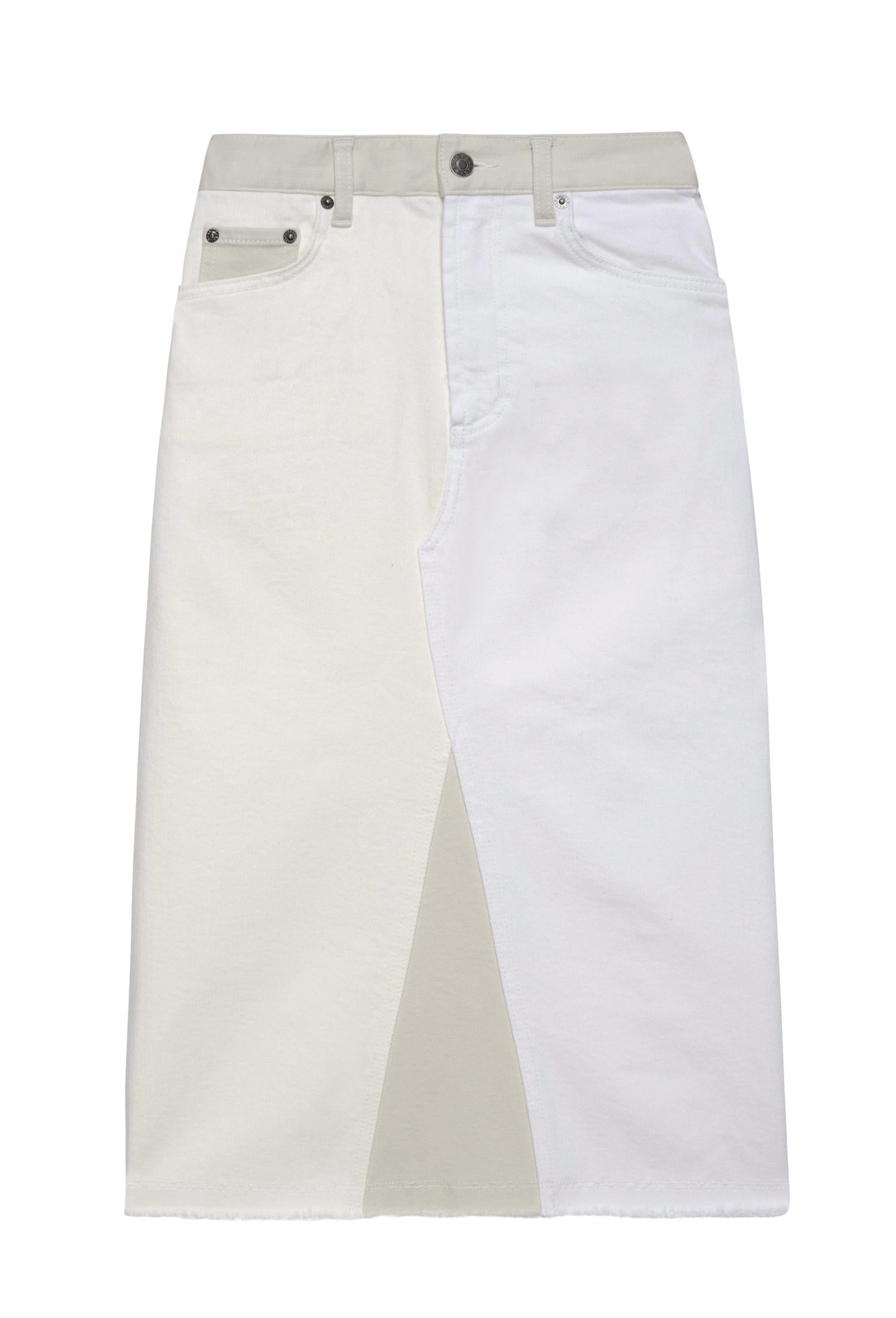 Sophisticated Ecru Patchwork. Effortlessly merges contemporary style with timeless elegance. Designed with high-waisted midi skirt. Intricate patchwork of neutral shades. Crafted from a soft comfort stretch fabric. Ensures both chic and wearability. Features a functional zipper fly and a back vent. Providing ease of movement and a flattering silhouette. Made from 98% cotton and 2% elastane. Offers the perfect balance of comfort and durability. True to size for the perfect fit. Stylish, yet practical ensemble.