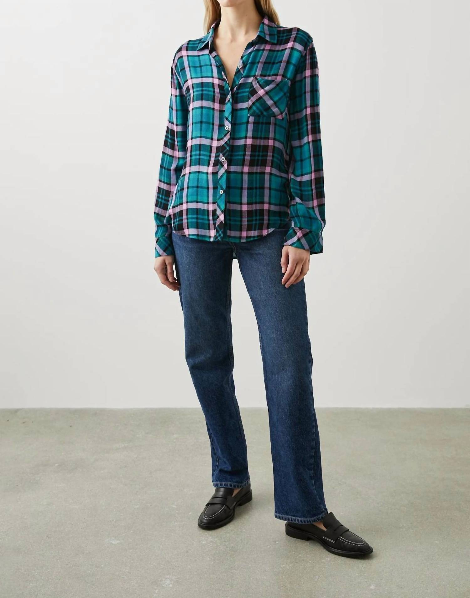 Uma camisa clássica de botões que nunca sai de moda. A Camisa Hunter da Rails em Aqua Lilac oferece um padrão xadrez clássico e xadrez, combinando perfeitamente estilo com elegância casual. Esta camisa de botões é feita de 100% rayon, com mangas longas e uma gola charmosa. Projetada para facilitar o estilo, inclui fechos de botão e bolsos para maior praticidade. Cuidados: Lavar à mão com água fria e pendurar para secar, com ferro frio, se necessário. A modelo, Alyssa, tem 1,78 m de altura e veste tamanho P.