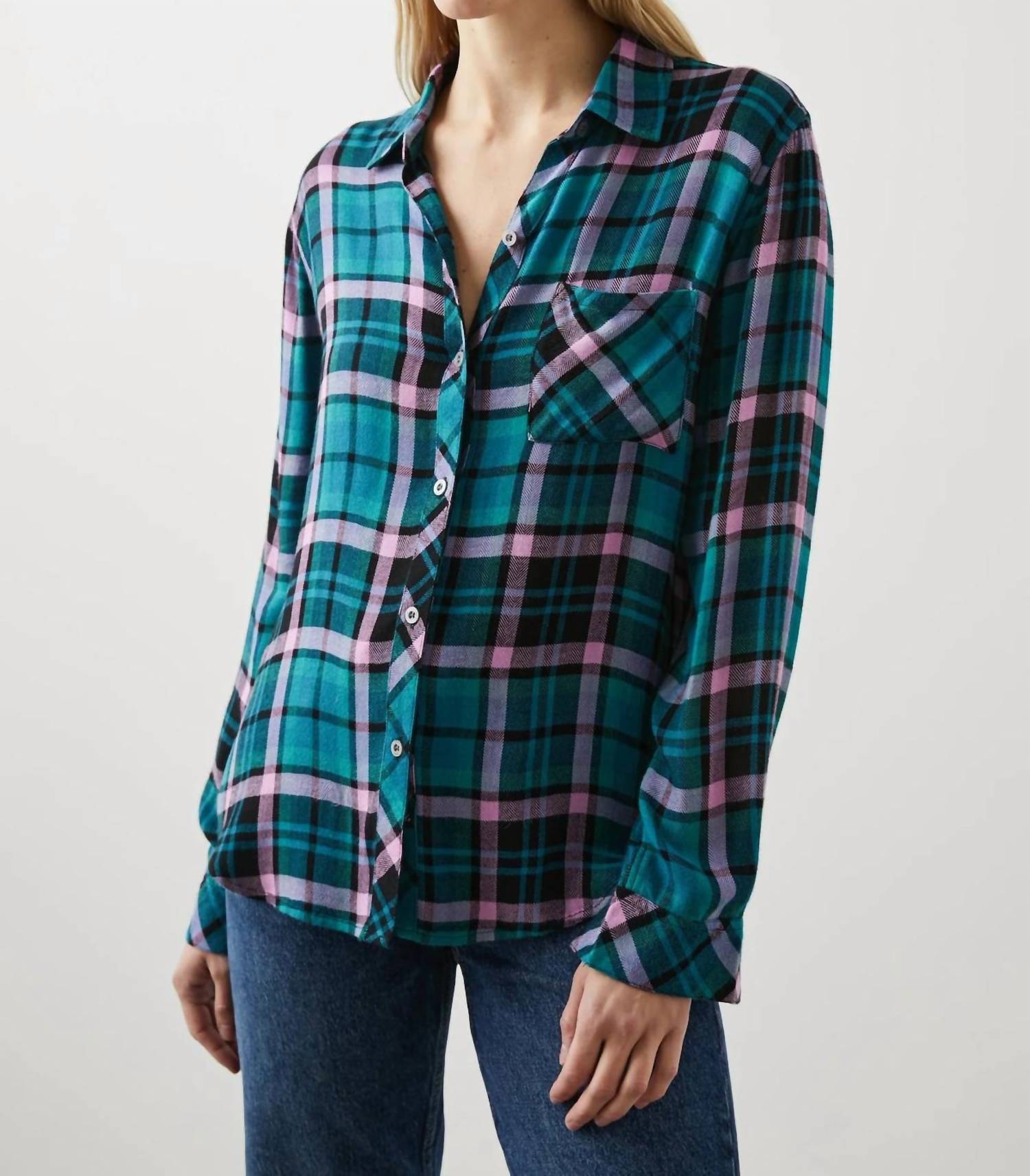 A Camisa Hunter da Rails em Aqua Lilac oferece um padrão xadrez clássico e xadrez, combinando perfeitamente estilo com elegância casual. Esta camisa de botões é feita de 100% rayon, com mangas longas e uma gola charmosa. Projetada para facilitar o estilo, inclui fechos de botão e bolsos para maior praticidade. Cuidados: Lavar à mão com água fria e pendurar para secar, com ferro frio, se necessário. A modelo, Alyssa, tem 1,78 m de altura e veste tamanho P.