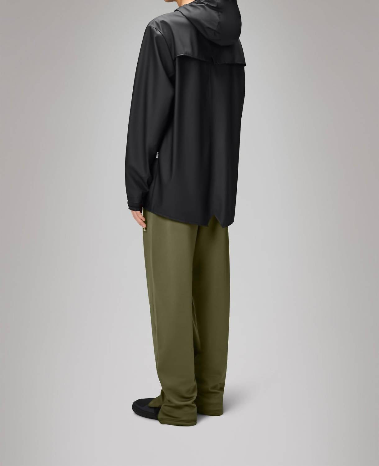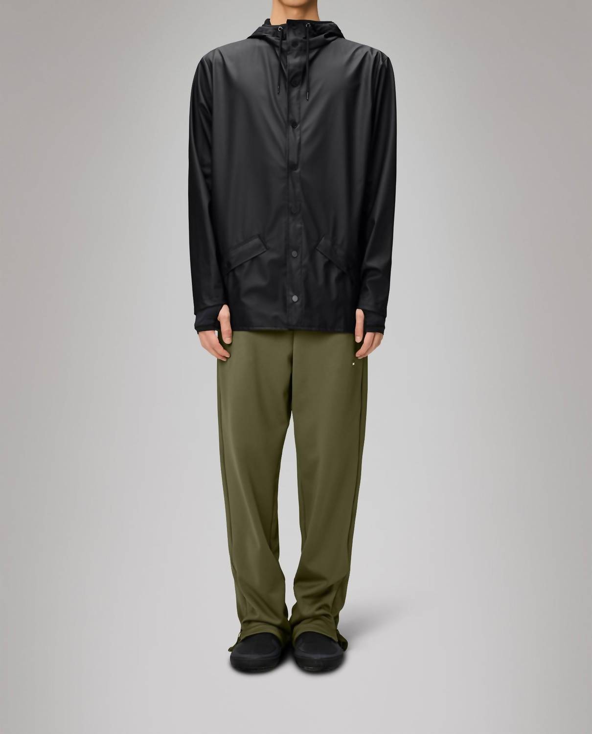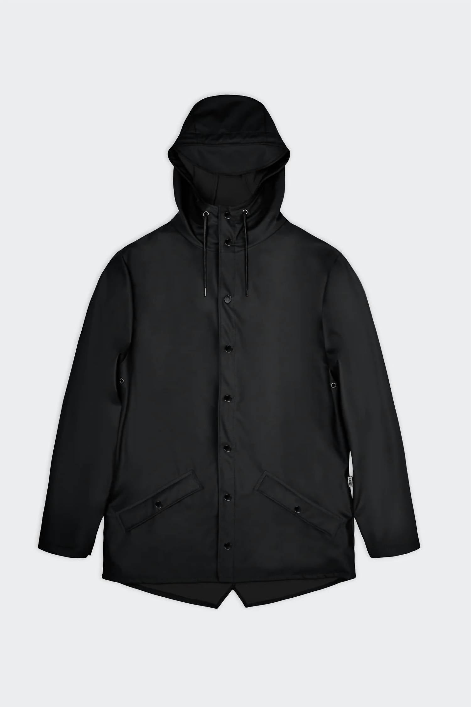 The Snap Closure Raincoat Jacket by Rains in a solid black color is perfect for fall hiking adventures. This unisex raincoat features long sleeves, a drawstring hood with a cap brim, and snap closure, making it both fashionable and functional. Crafted from 100% polyester with a polyurethane coating, the jacket offers waterproof and windproof protection with a casual fit and ultrasonically welded seams for durability. Measuring 30.9 inches in length, it includes engineered ventilation features and snap-adjustable cuffs to enhance comfort, while requiring simple machine wash care.