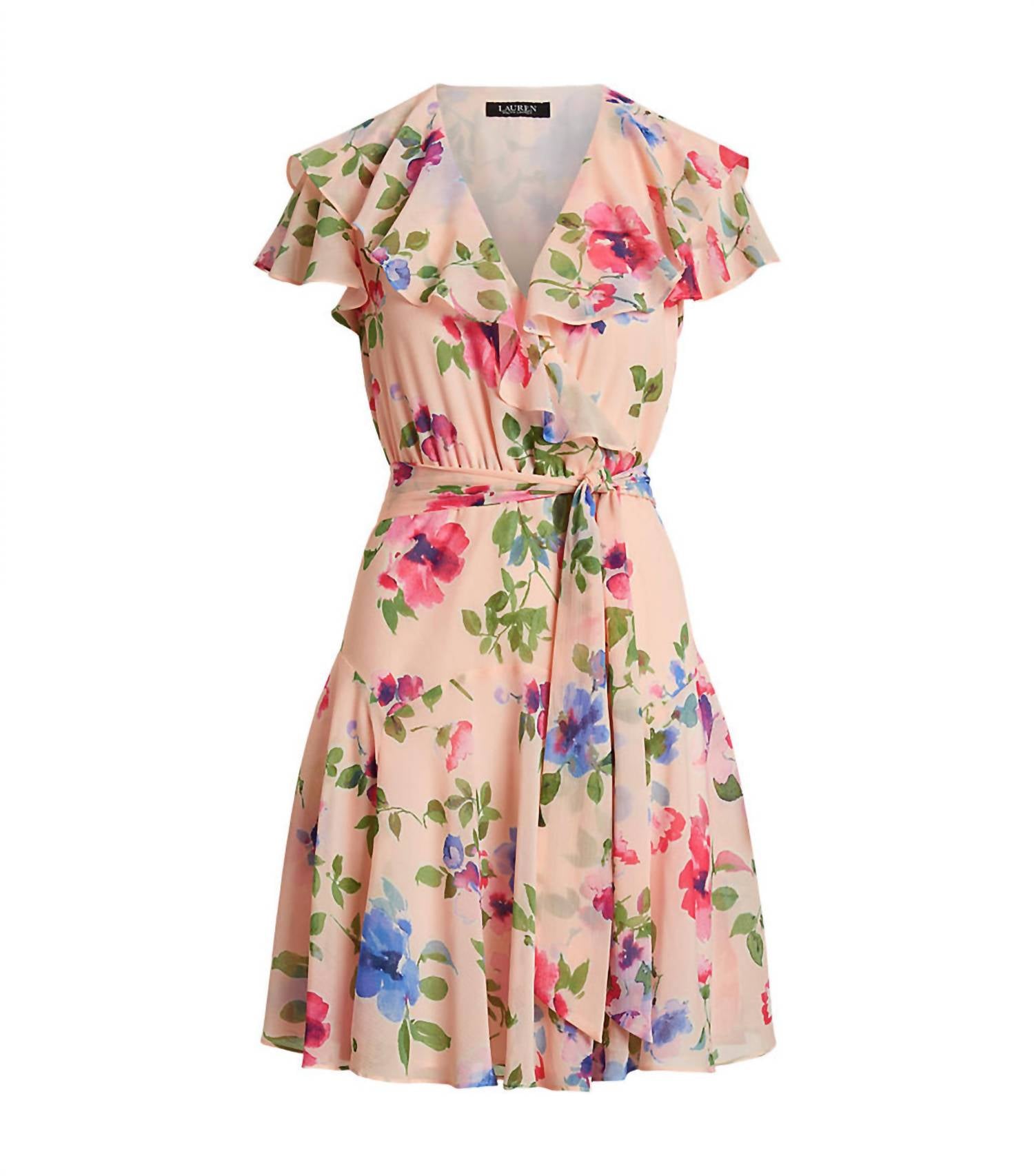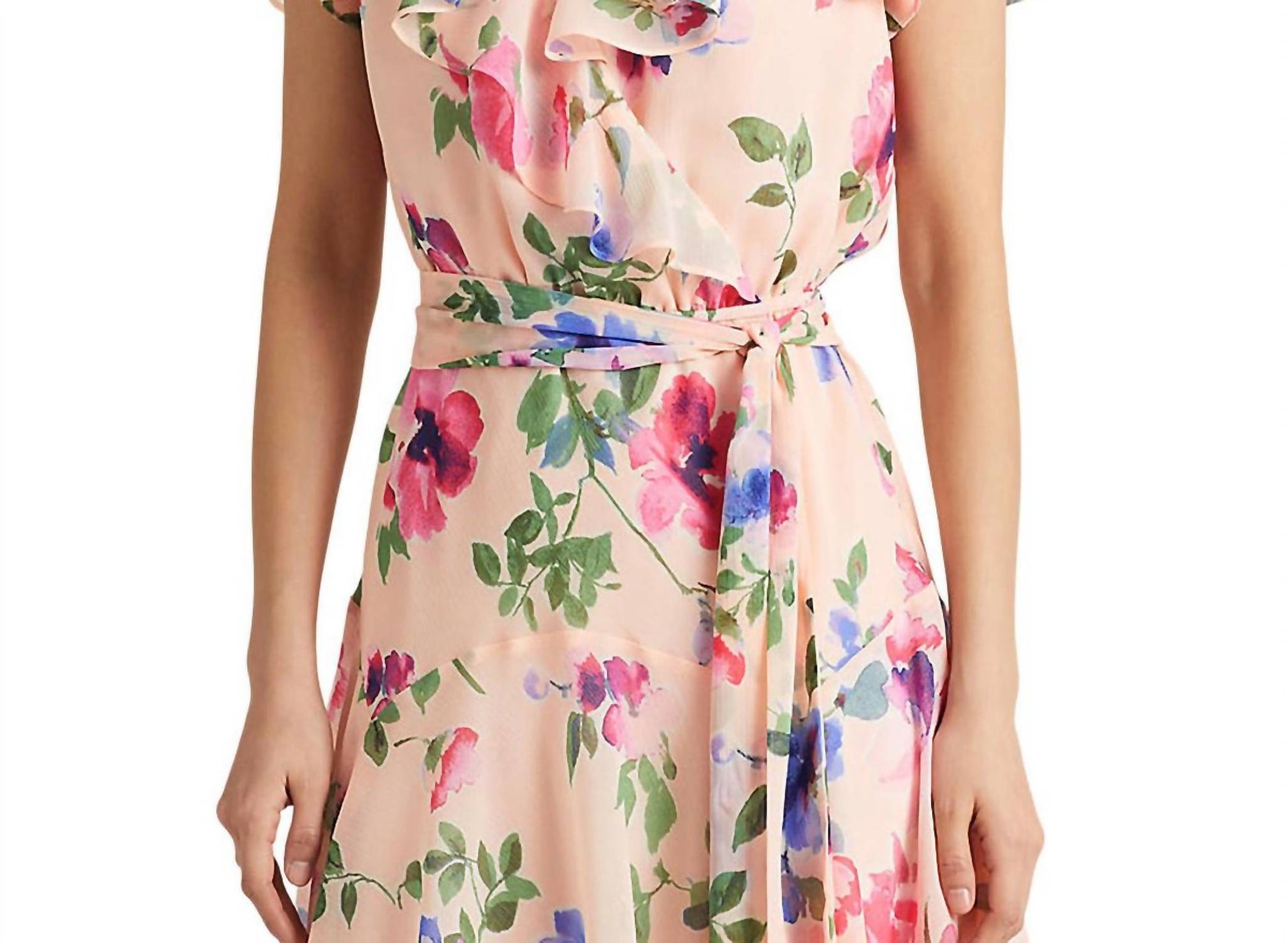 Introducing the Jatrissa Short Sleeve Dress by Ralph Lauren, a stunning floral piece in Pink Multi designed to enhance feminine charm. This fit-and-flare style features short flutter sleeves and a ruffle-trimmed surplice neckline, with a self-belt and threaded belt loops to accentuate the waist. 65% Recycled Polyester, 35% Polyester. Garment Length: US size 8 has a 93 cm body length, intended to hit above the knee. Tie closure. Dry clean only.