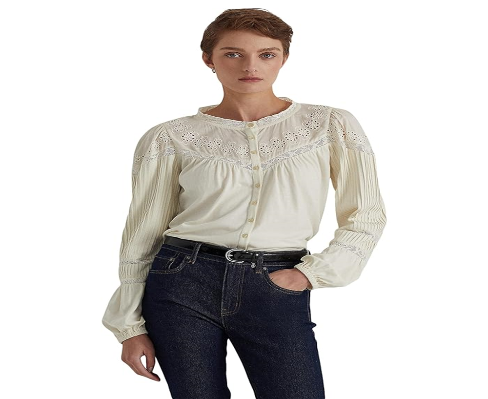 O charmoso bordado com ilhós confere uma sensibilidade graciosa à blusa LAUREN Ralph Lauren de algodão misto bordado com ilhós | Desenhada com mangas bufantes e botões perolados gravados LRL para um visual elegante | Caimento relaxado | Projetado para atingir a parte inferior do quadril | Decote redondo com acabamento em renda | Carcela frontal com botões | Mangas longas bufantes com punhos elásticos