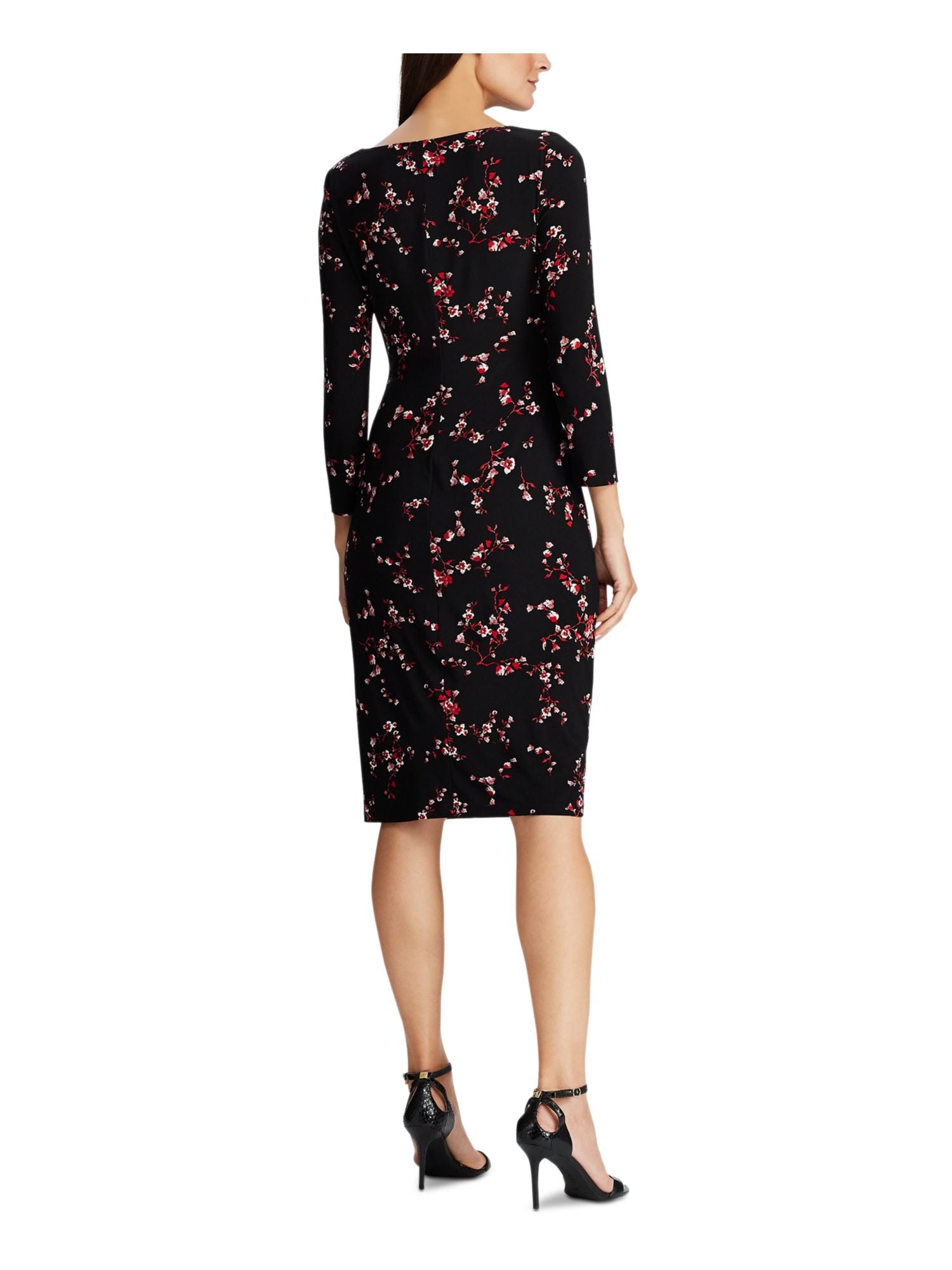 Vestido de festa feminino Ralph Lauren com estampa floral, manga 3/4, decote em V, acima do joelho, preto, tamanho 0
