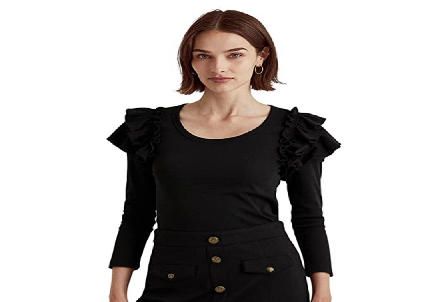 Mangas com babados dramáticos distinguem este top de malha essencial da Ralph Lauren | que é feito de algodão com elasticidade para um toque macio e facilidade de movimento | Corte slim | Decote redondo | Mangas três quartos com babados | Bainha reta com detalhe do logotipo bordado à direita | Estilo pullover