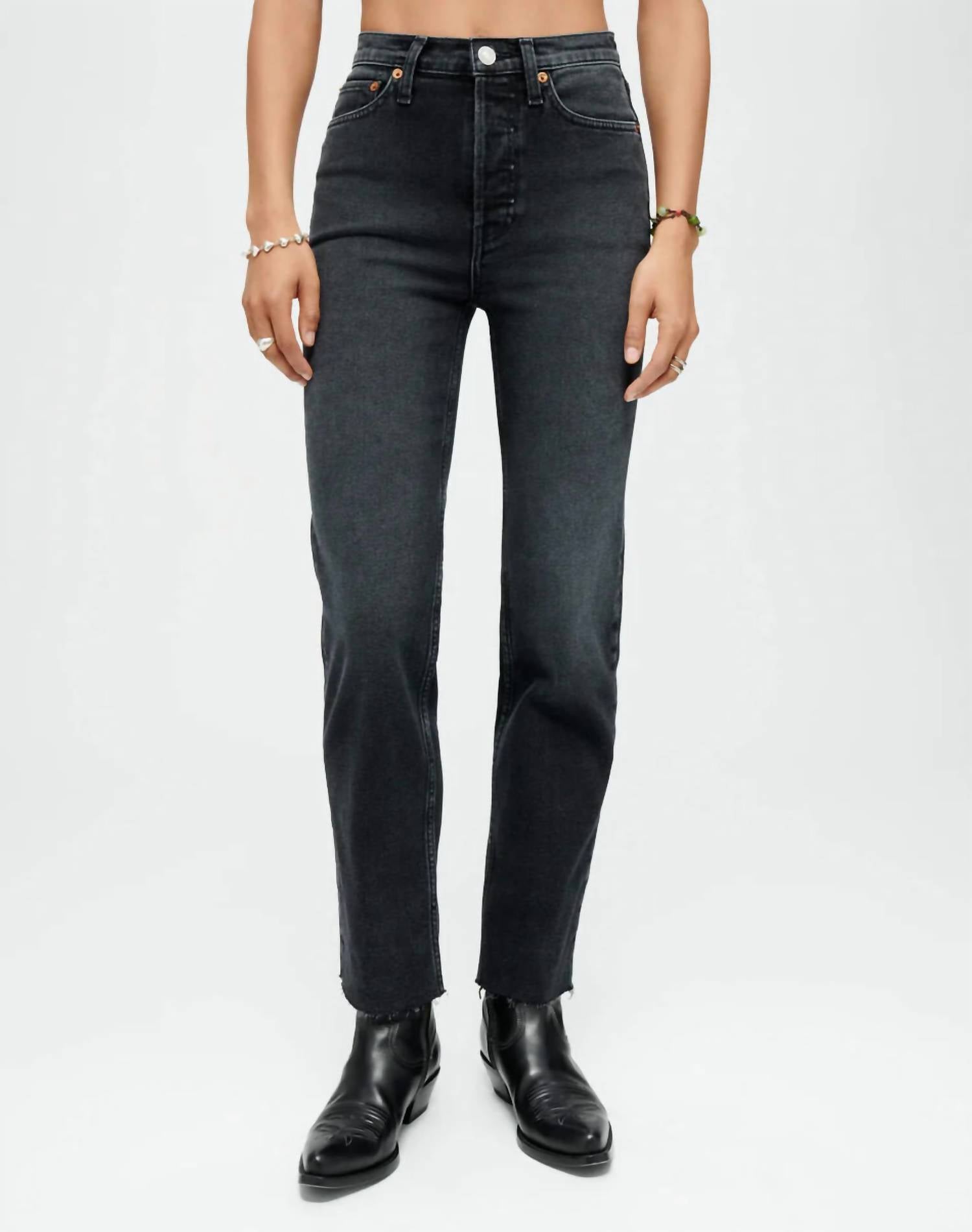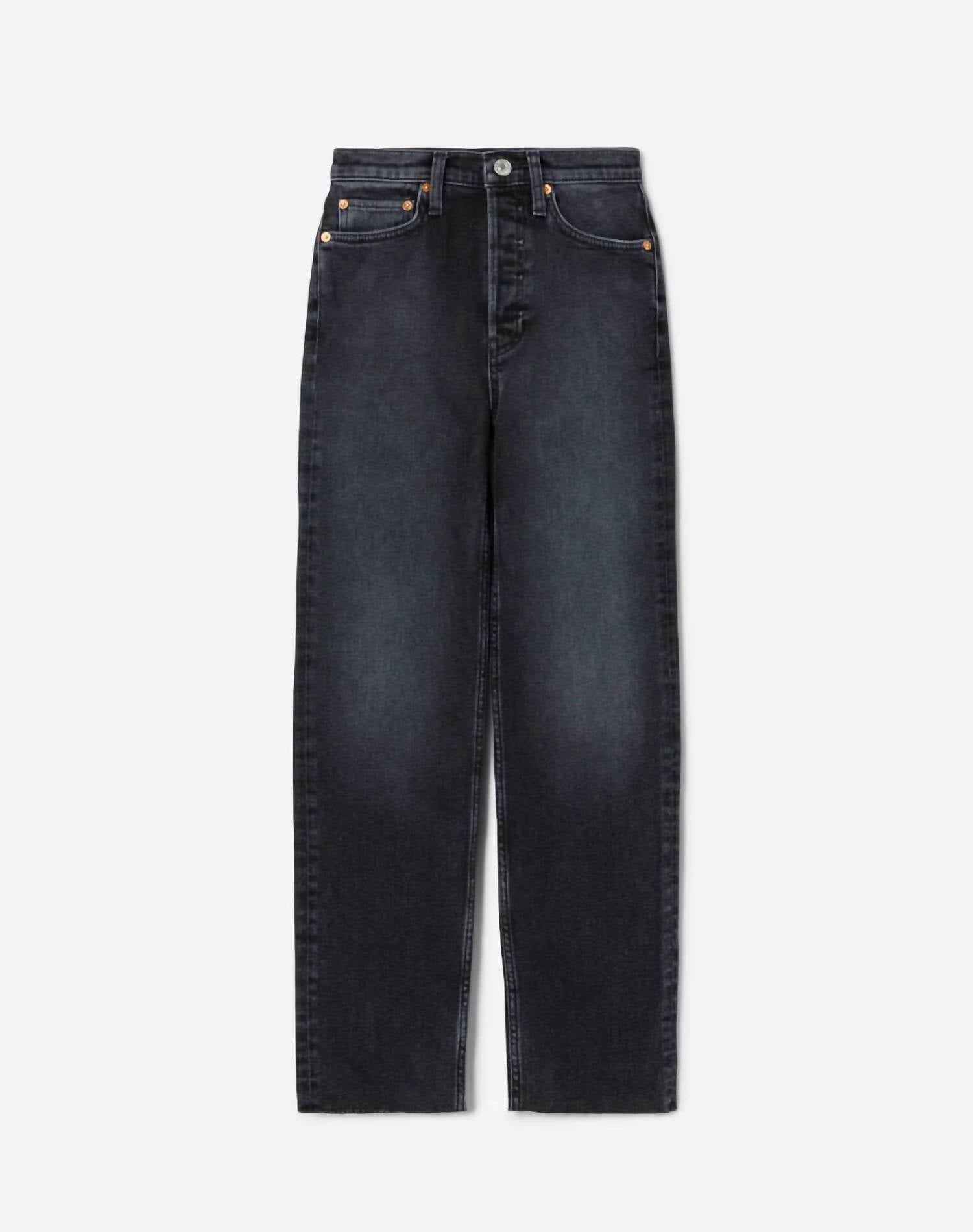 Coloque sua camiseta favorita dentro deste jeans de cintura alta para uma sensação mais casual e descolada. Eleve seu guarda-roupa com a calça jeans RE/DONE Seventies Stovepipe em Washed Noir, uma versão moderna do estilo clássico dos anos 70, com cintura alta, corte reto e costura interna cropped. Confeccionada com elasticidade mínima para maior conforto, esta calça apresenta uma lavagem preta desgastada que lembra o jeans original de estoque. Ela conta com bolsos práticos e um fecho clássico de botão, além de bainha crua para um toque ousado. Perfeita para o estilo streetwear ou para um look chique para um jantar, esta calça combina perfeitamente a influência vintage com a elegância moderna.