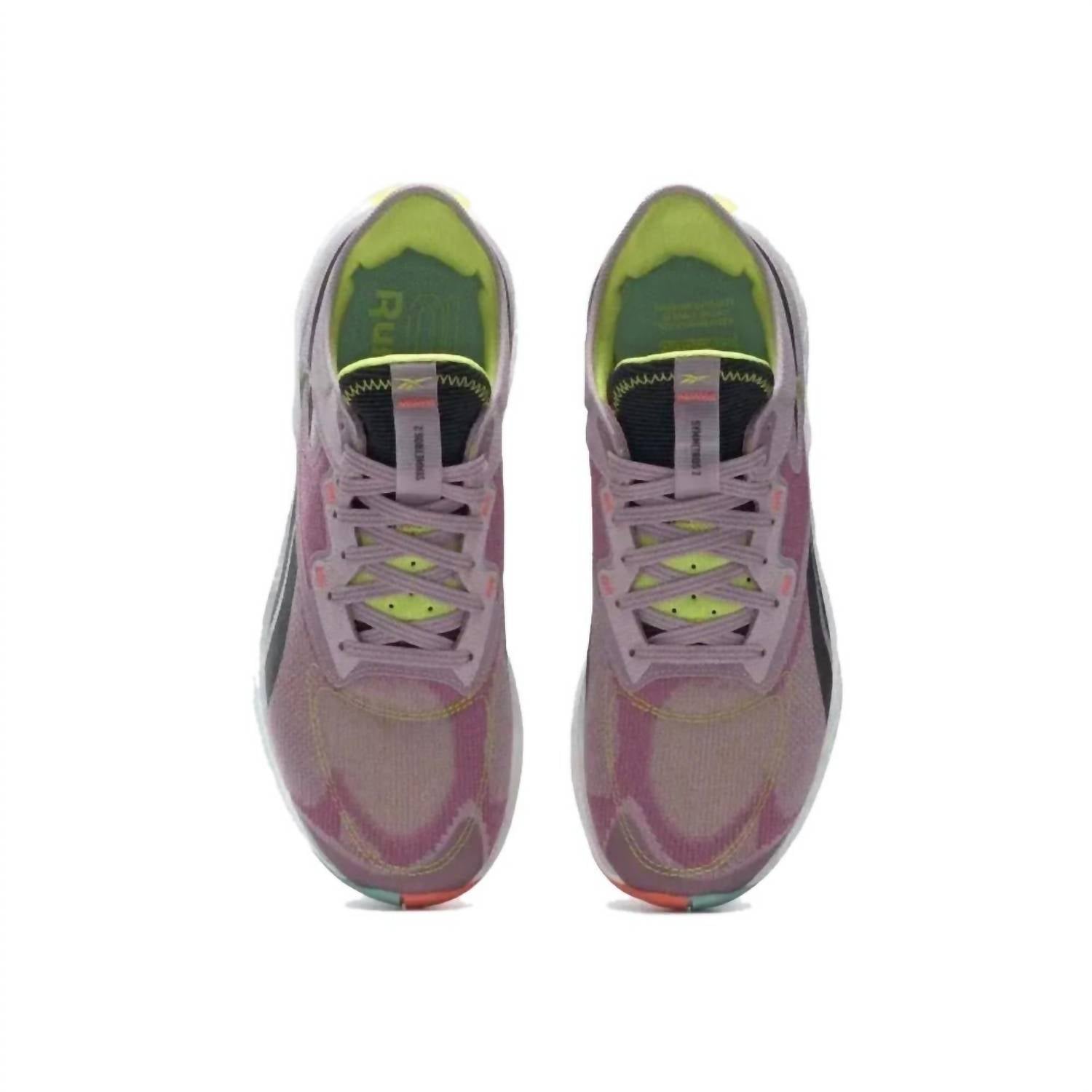 Experience ultimate versatility with the Women's Floatride Energy Symmetro 2 Running Shoes by Reebok, perfect for city streets, park paths, or the local track. These athletic shoes come in a striking lilac and yellow color, featuring a breathable mesh upper for cool comfort. The round toe design and flat heel ensure a secure and comfortable fit for your workout. Enjoy lightweight and responsive cushioning with Floatride Energy Foam, making them ideal for long runs and intervals.