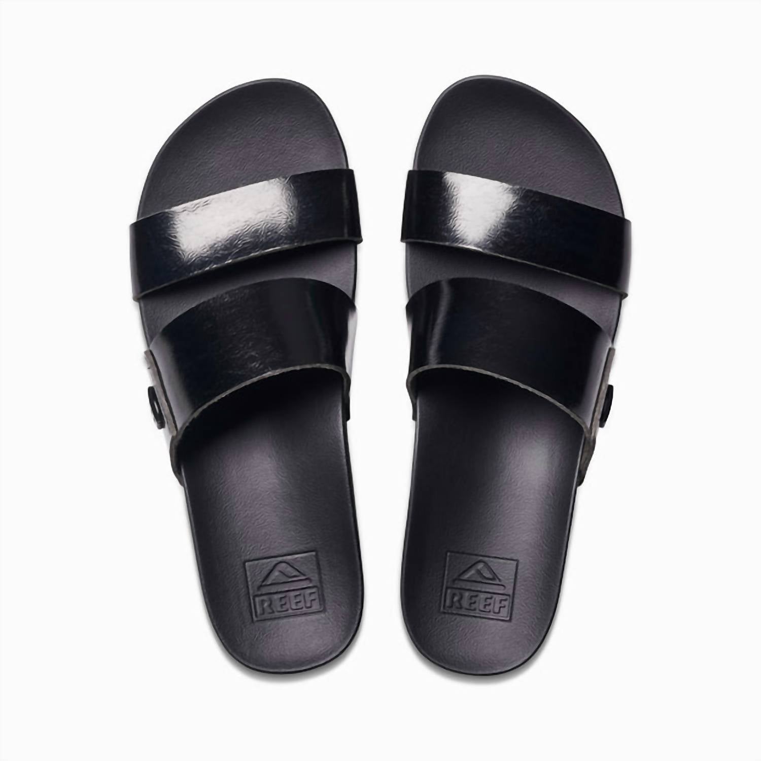 Step up your summer wardrobe with the Women's Cushion Vista Higher Sandal by REEF, perfect for preppy vacation wear. These chunky platform sandals boast a 2.5-inch lightweight EVA outsole, featuring a super soft unlined PVC free vegan leather two-strap design in sleek black. They promise ultimate comfort with a wider footbed enveloped in 100% natural cork, providing excellent arch support and heel cupping. Complete your look with these chic sandals, perfect for sunny days and beyond.