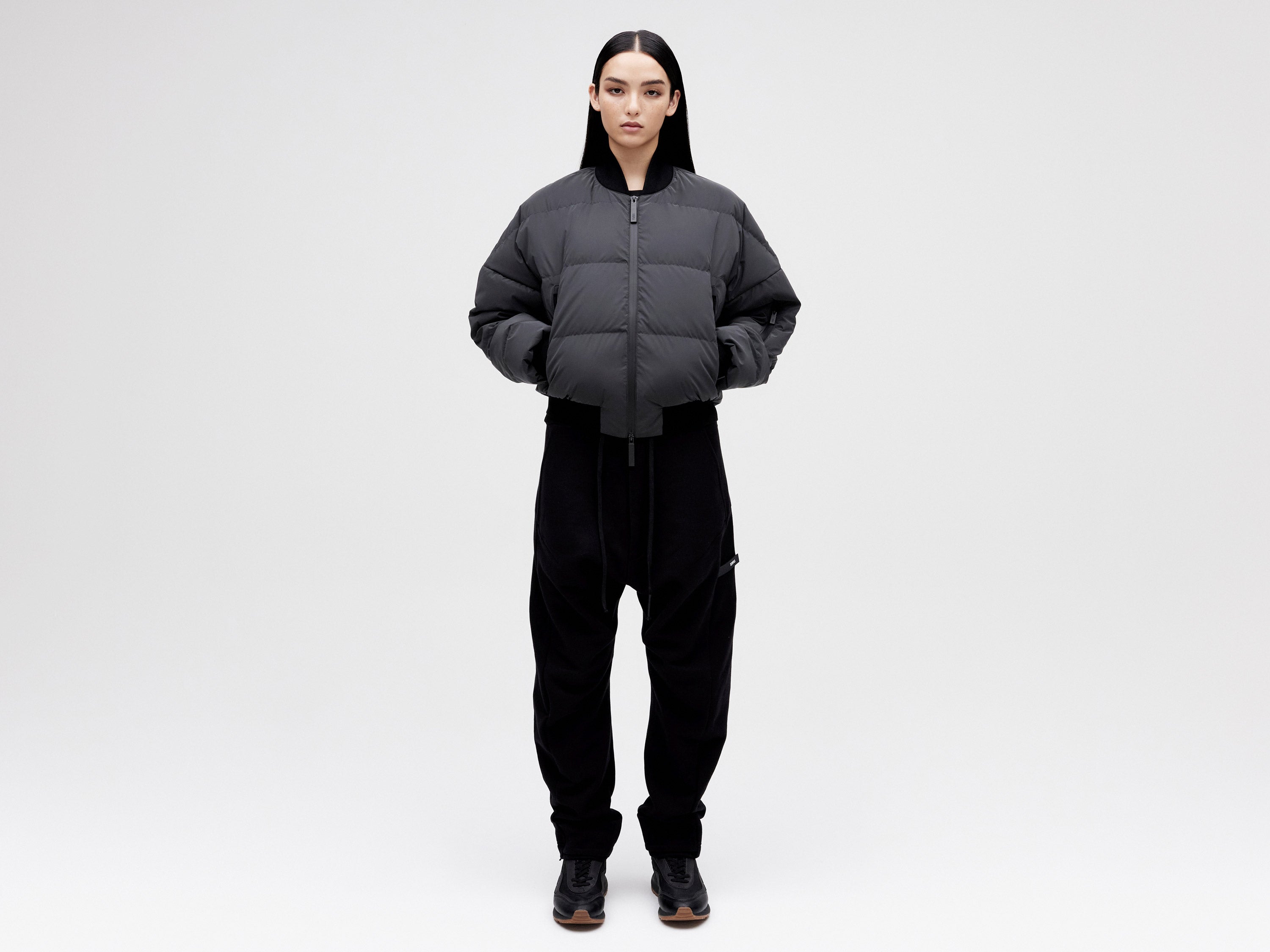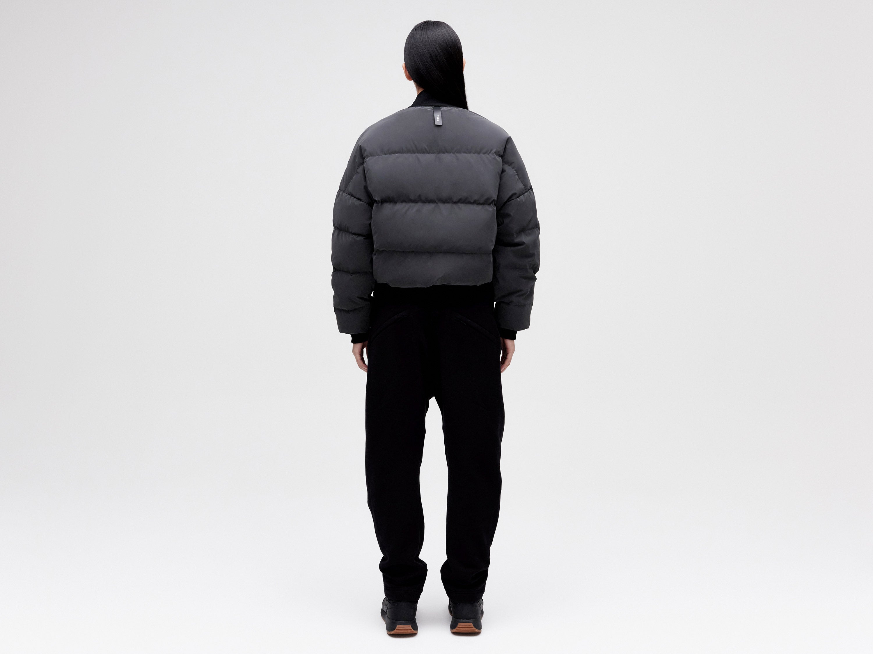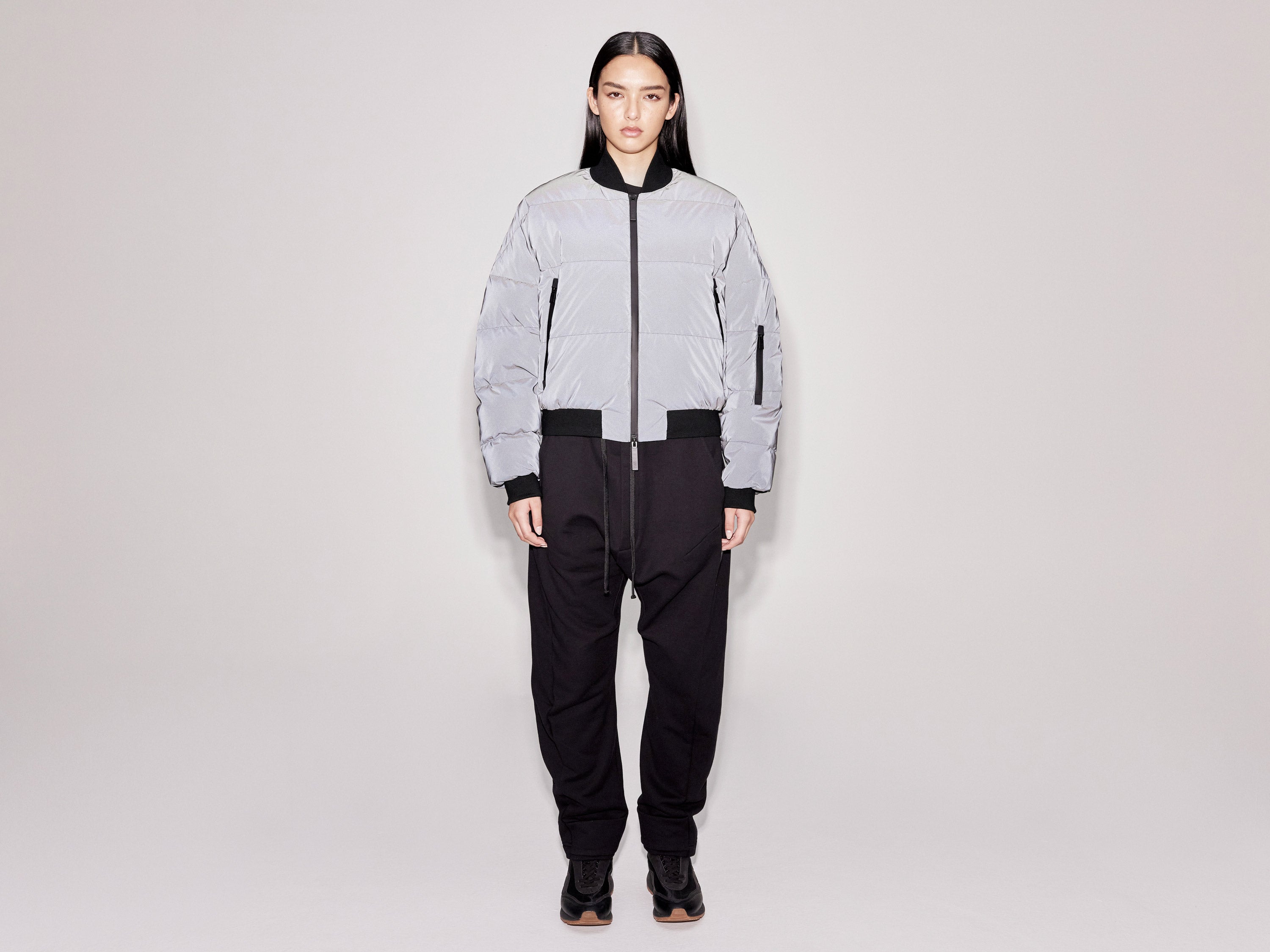 Our Reflective Bomber Down Jacket is designed with a contemporary oversized waisted fit and is finished with a ribbed collar and cuffs. It offers optimal insulation thanks to its premium white goose down padding and features a hyper-reflective shell fabric that is impregnated with thousands of micro-glass spheres for a unique appearance and hand feel.