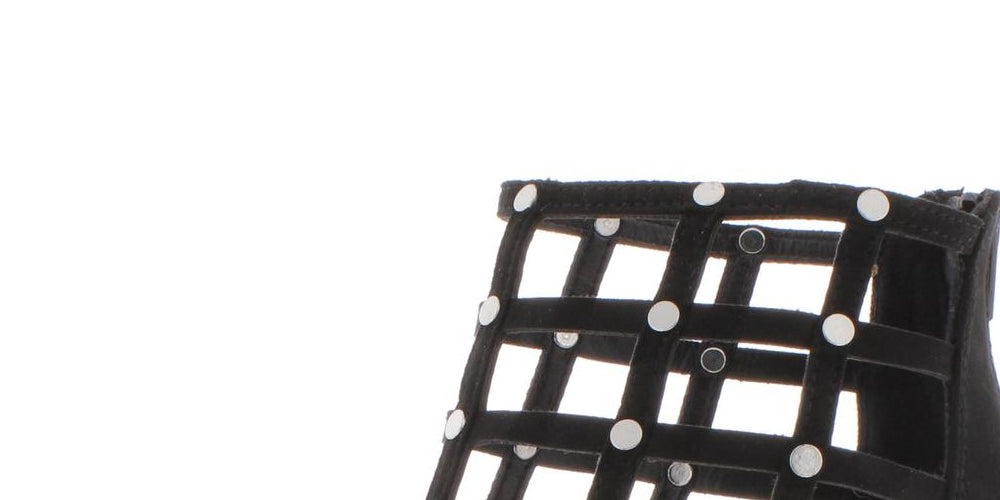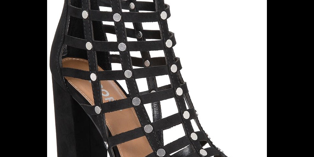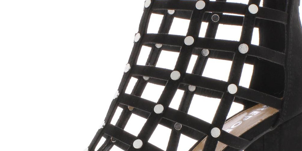 Sandálias gladiadoras com bico redondo e fivela | Fecho de zíper na parte de trás; tachas nas tiras | Cabedal sintético; sola sintética