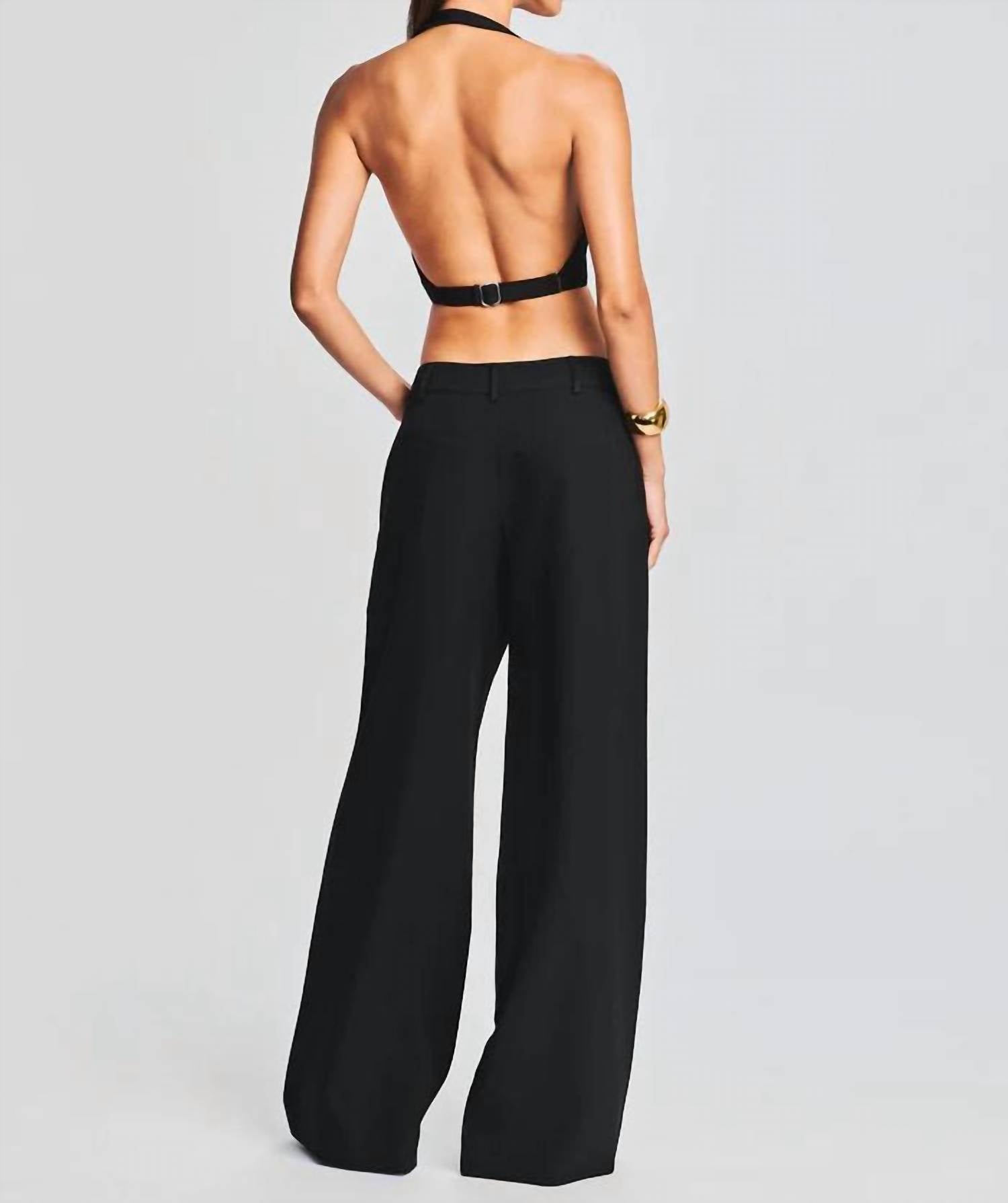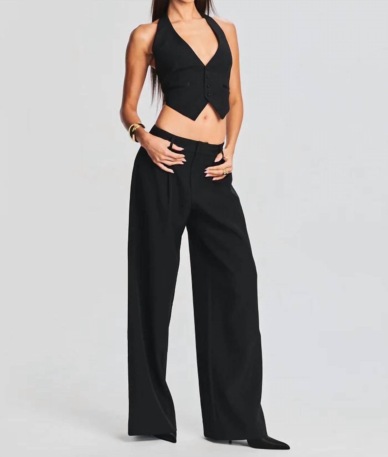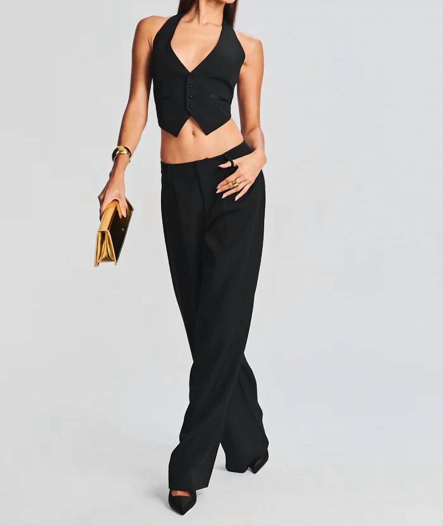 Show a little skin in this cute and casual crop top. Elevate your style with the Florence Vest by Retrofete, a sophisticated piece perfect for any holiday party. This sleeveless crop top in classic black features a chic halter neckline, front button closure, and an open back with a lower buckle strap. Crafted from a blend of 93% Polyester and 7% Spandex, this vest offers a sleek and comfortable fit. Made in China, it's ideal for quiet luxury styling on New Year's Eve. Model is 5'10" and wearing a size XS.