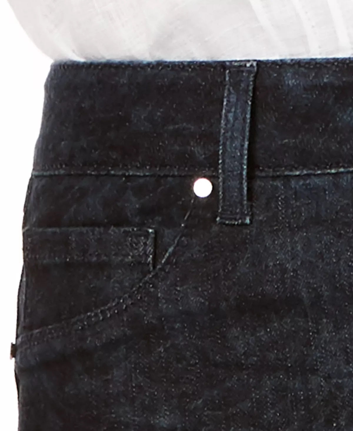 Costura interna aprox.; 29-1/2 | Cintura alta; aprox. 10-1/4; abertura da perna; aprox. 10 | Fecho de zíper e botão na frente; passantes para cinto | 2 bolsos frontais falsos; 1 bolso frontal para moedas; 2 bolsos traseiros | Algodão/poliéster/rayon/Lycra® elastano
